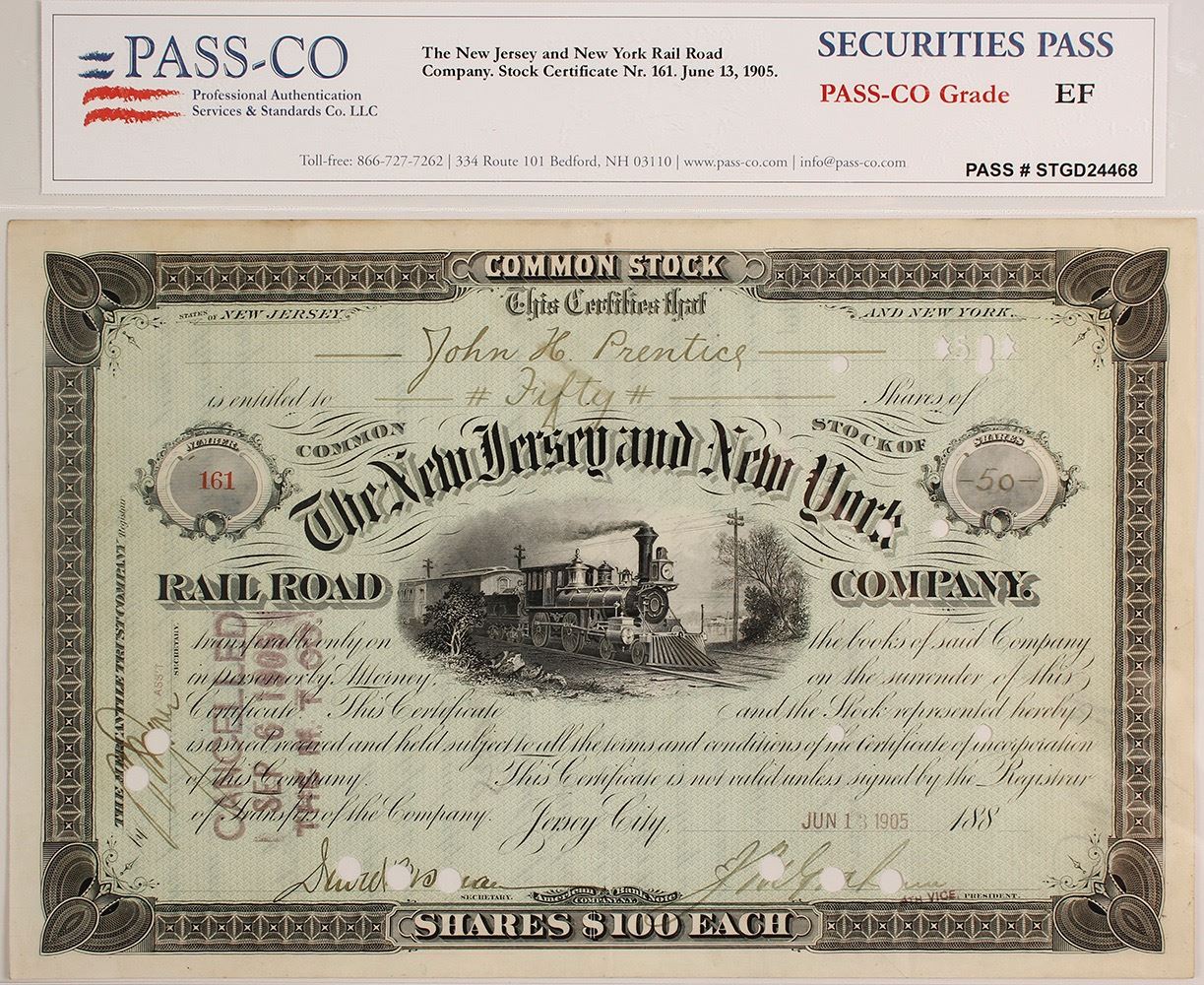 No. 161, issued for 50 shares to John H. Prentice on June 13, 1905. Signed by the secretary and assistant vice-president. Punch cancelled signatures. Green background and attractive locomotive vignette. In Pass-Co holder, graded EF. (Al Adams Gold Rush Memorabilia Collection) HWAC# 60003 Date: 1905 Location: New Jersey