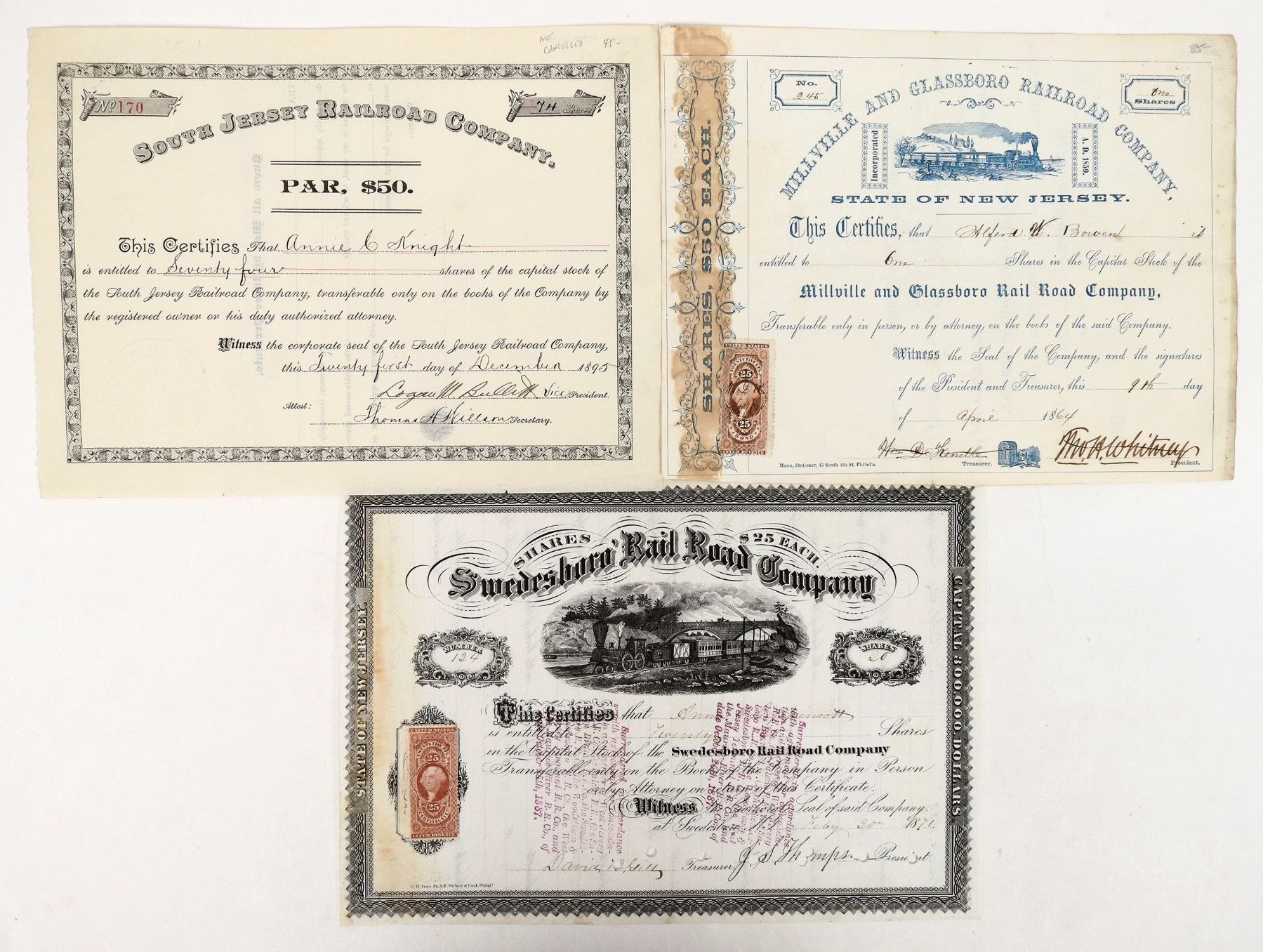 Issued stocks-1871 Swedesboro, 1895 South Jersey, 1864 Millville and Glassboro.