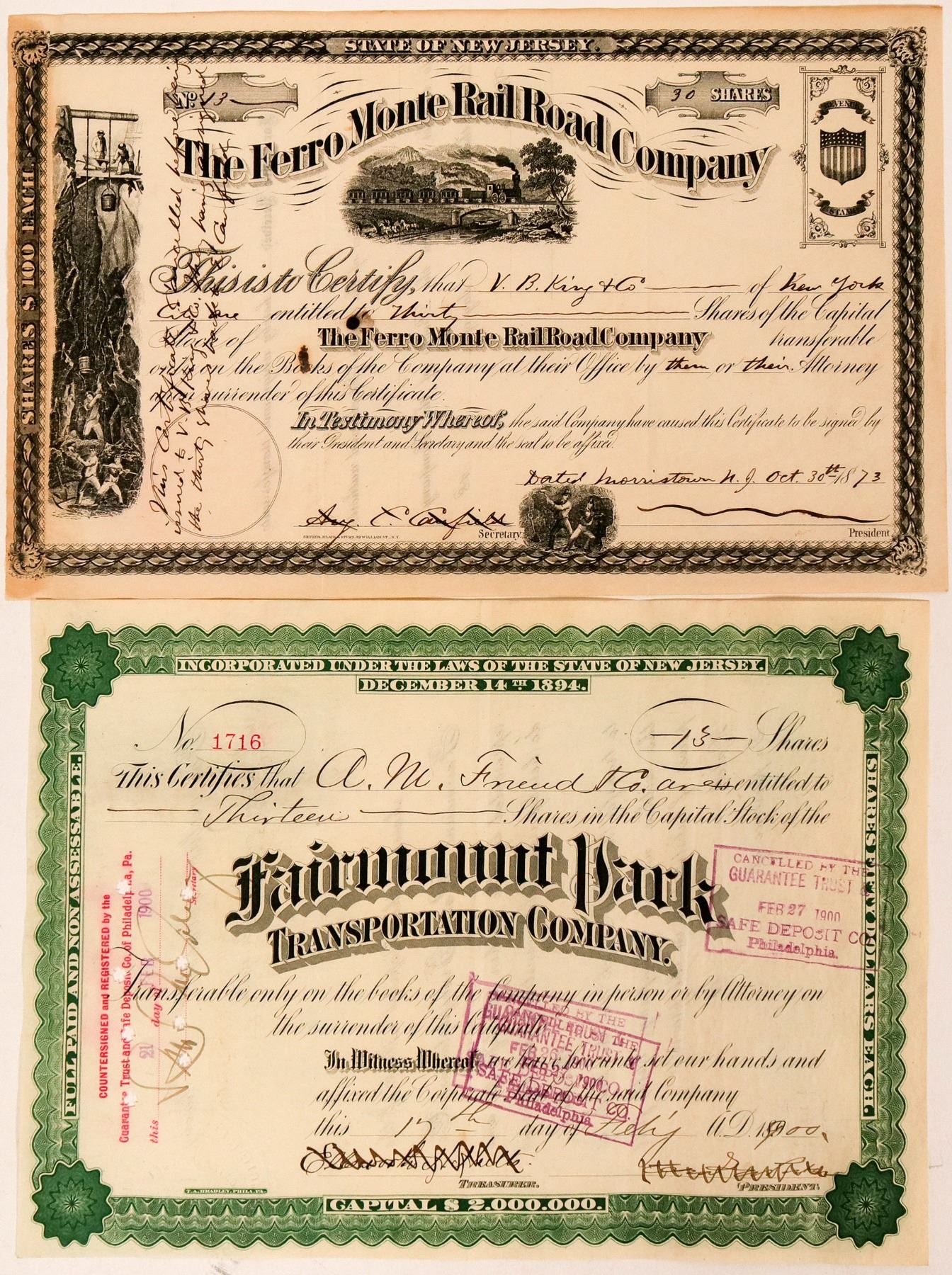 2 certificates. 1. Fairmount Park Transportation Co. incorp. 1894. #1716, I/C, $50 shares issued 1900 (Handwritten,cert. dateline 189_), Green, embossed seal, no vignette, T.A. Bradley printer. VF 2. The Ferro Monte Rail Road Co. incorp. 1869 , #13, I/C, $100 shares issued May 28, 1873, signed by secretary. Black, embossed seal, vignettes: top coal train, left miners aroking shaft, bottom monersin mine. Snyder , Black & Sturn printer. EF