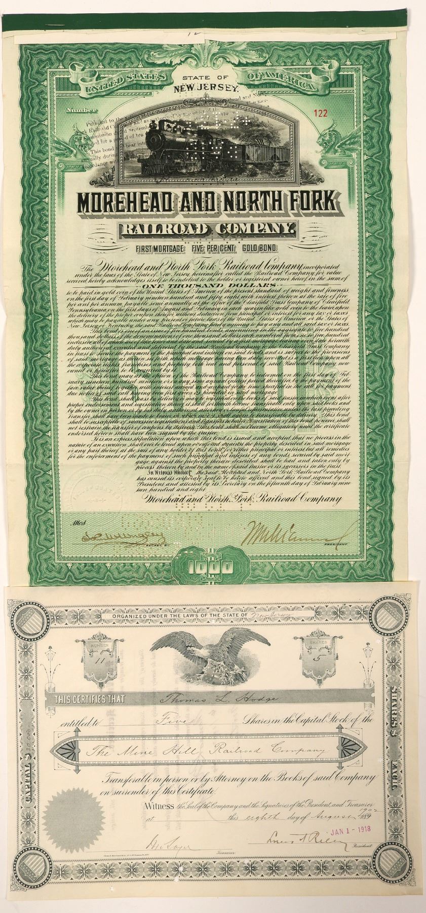 Morehead and North Fork railroad Co. #122, I/C, $1000 5 1/2 % First Mortgage gold bearer bond. Issued Feb 15, 1908, signed President illegible, GREEN, embossed seal, vignette 4-4-2 coal train r-l , "$1000" green underprint box/sunburst white numbers, coupons missing. Security Bank Note Co printers. VF