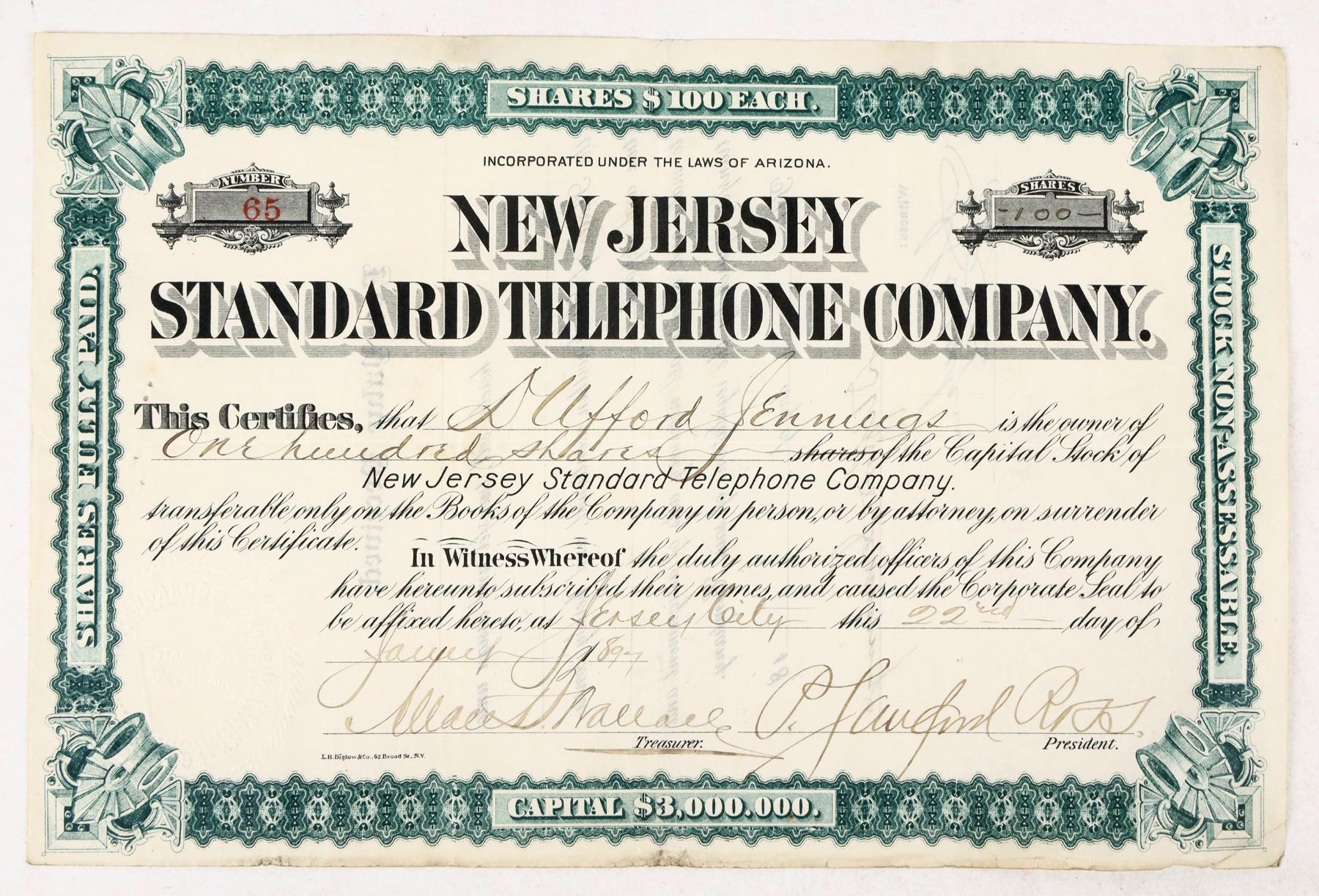 Inc. in Arizona. No. 65, issued for 100 shares to Clifford Jennings in 1897. Signed by president Ross and treasurer Wallace. Not cancelled. Green border and black print.