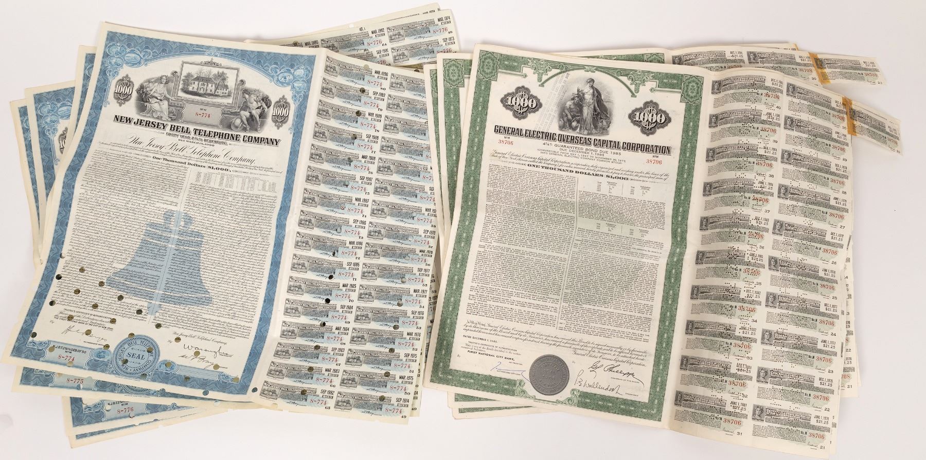 Four General Electric Oversees Capital Corporation bond. 1965. Allegorical. Very nice condition. Coupons 20 to 40 attached. Sequential numbering. Not cancelled. Four New Jersey Bell Telephone Company blue bonds. Sequential starting with 8-774. Blueprint Bell Tell logo underprint. Cancelled. New Jersey