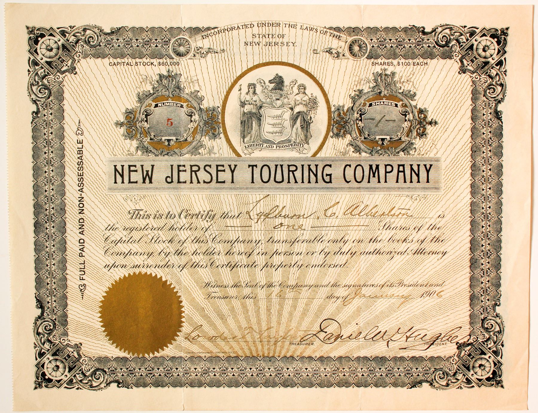 1 share of New Jersey Touring Co cert. #5 dated Jan 16, 1906 issued to Lylbuon C. Albertson, Atlantic City, NJ . Inc. NJ. Gold seal, grey border. Interesting vignette o two women with staffs surrounding a shield reading "Liberty and Prosperity" with horse head over the top of shield. This company, like many others of this time period, started small and may have only lasted a few years and maybe in a limited number of states. No information on the company as to dates of operation, owners, even states in some cases, earlier name and if they consolidated with another company, went into bankruptcy or just closed. Prag collection.