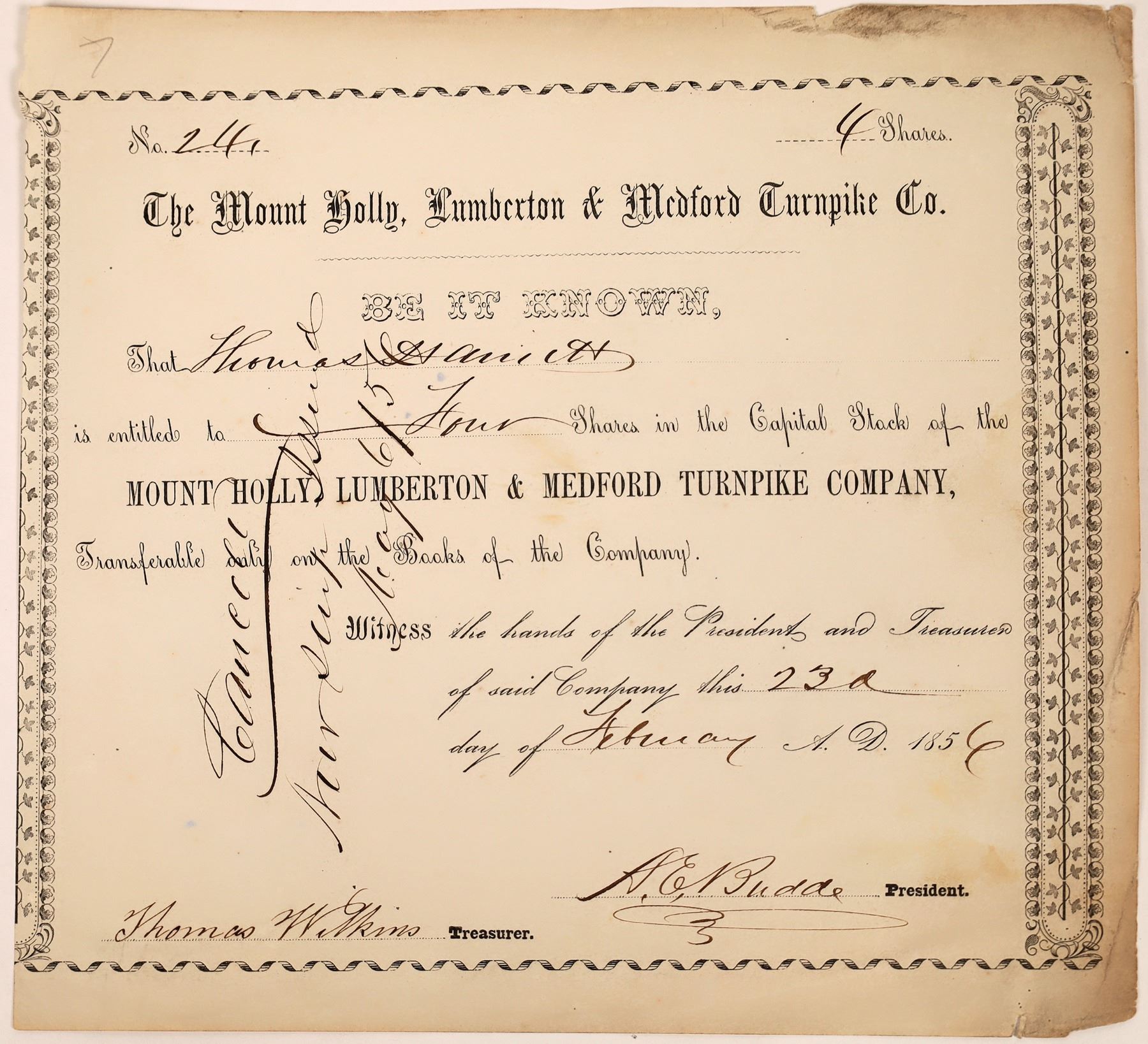 Rare stock certificate issued by The Mount Holly, Lumberton & Medford Turnpike Company to Thomas Hamitt (sp?) four shares. Cert is signed by president A.E. Budde and treasurer, Thomas Wilkins. There appears to be a handwritten cancel. The cert is dated February 23, 1856. Please see photos for more detail and condition.
