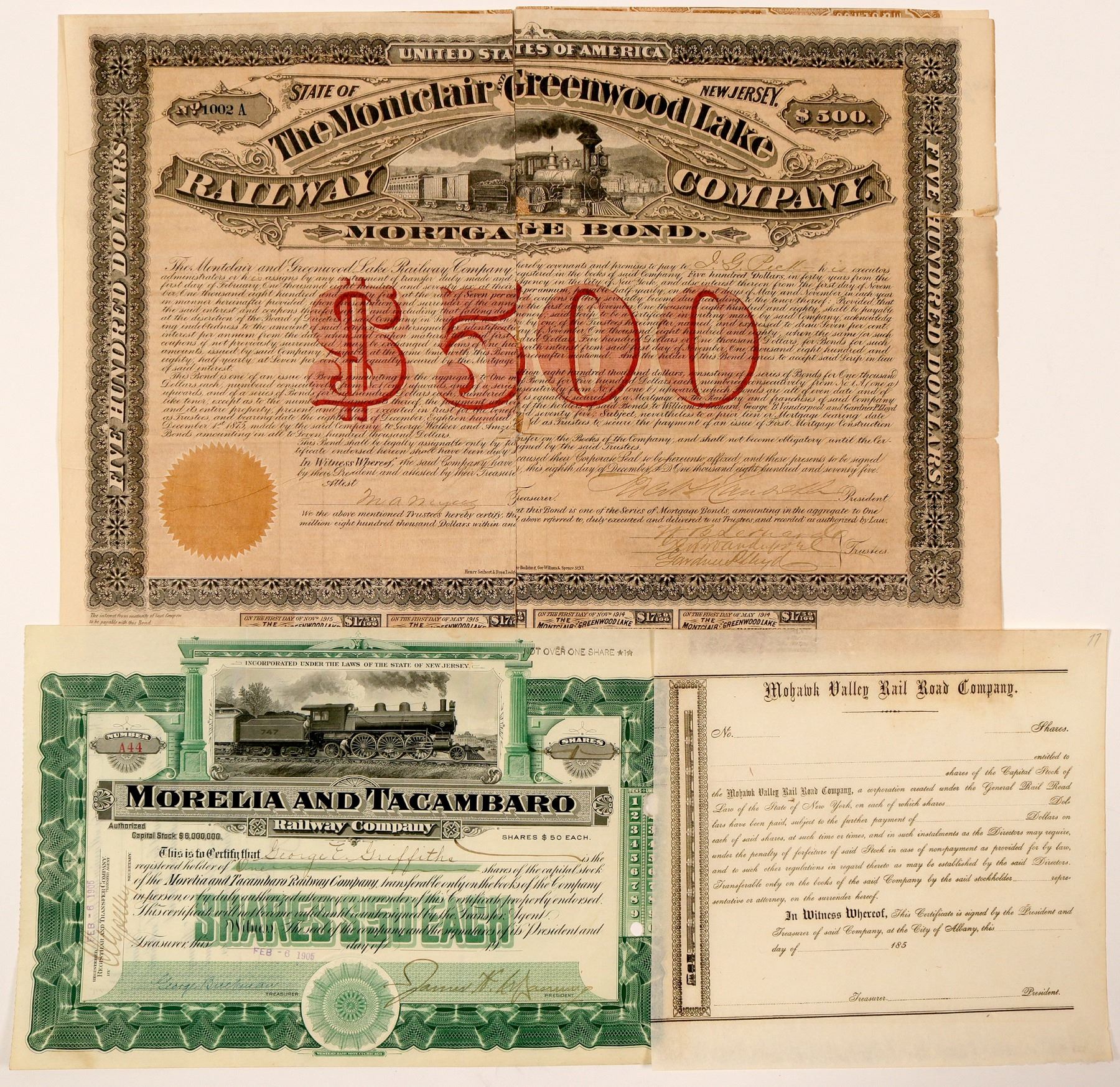 The Montclair and Greenwood Lake Railway Co. I/U #1002A, $500 7% mortgage bond, issued Dec 8, 1875, black, embossed seal, vignette 4-4-0 passenger train l-r, "$500" red underprint, all coupons attached. This is in fragile condition and is separated at the center fold Ken Prag Collection