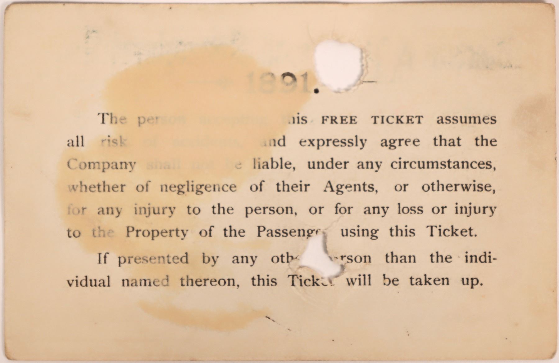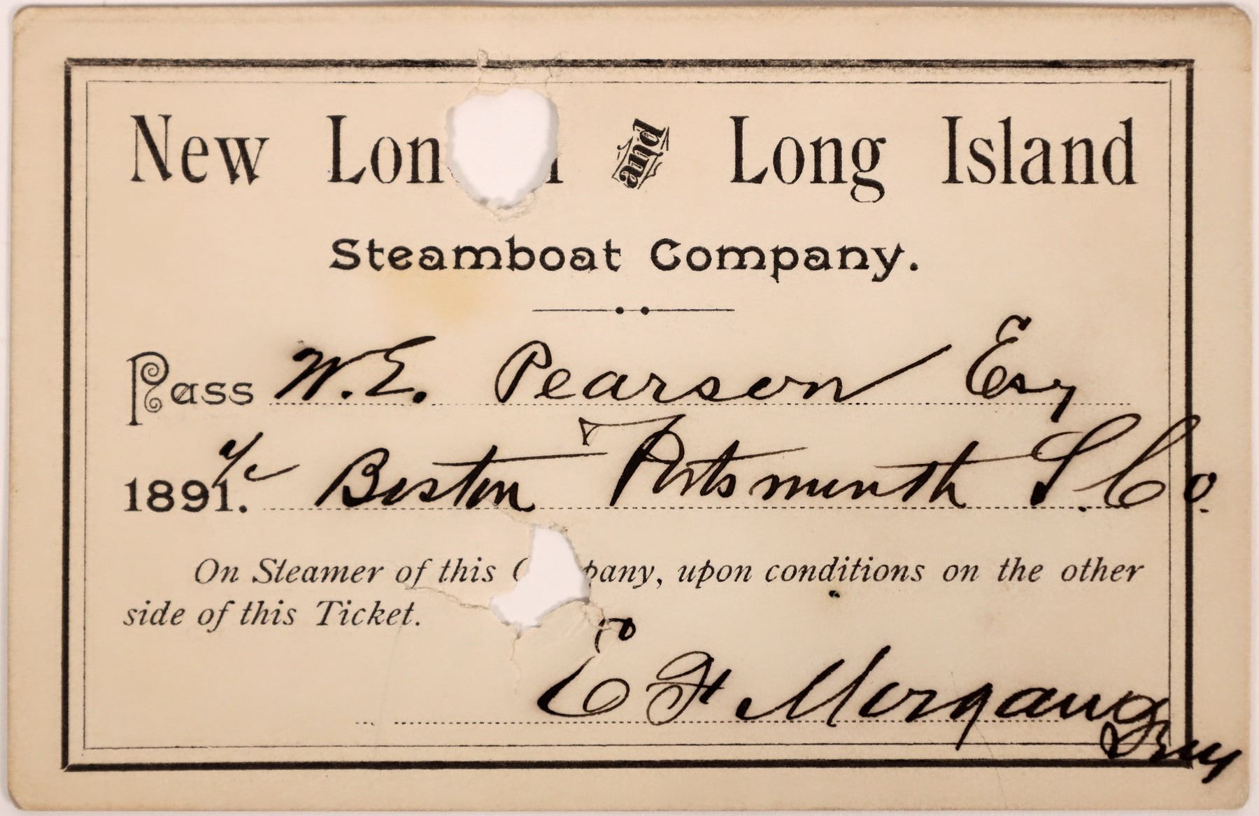 Pass for 1891 issued to WE Pearson of the Boston & Portsmouth Steamboat Company. Signed by E. Morgan, secretary. Two punch holes, paper residue on reverse. Black print on cardstock. Operated between New London, Connecticut and Sag Harbor (Long Island, New York). New London Connecticut