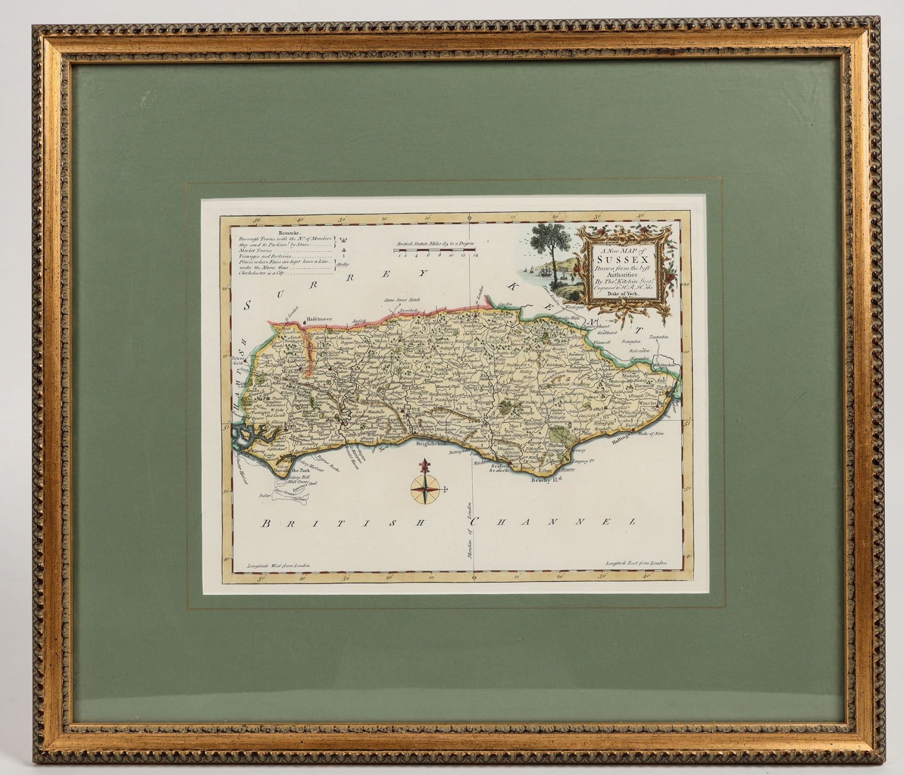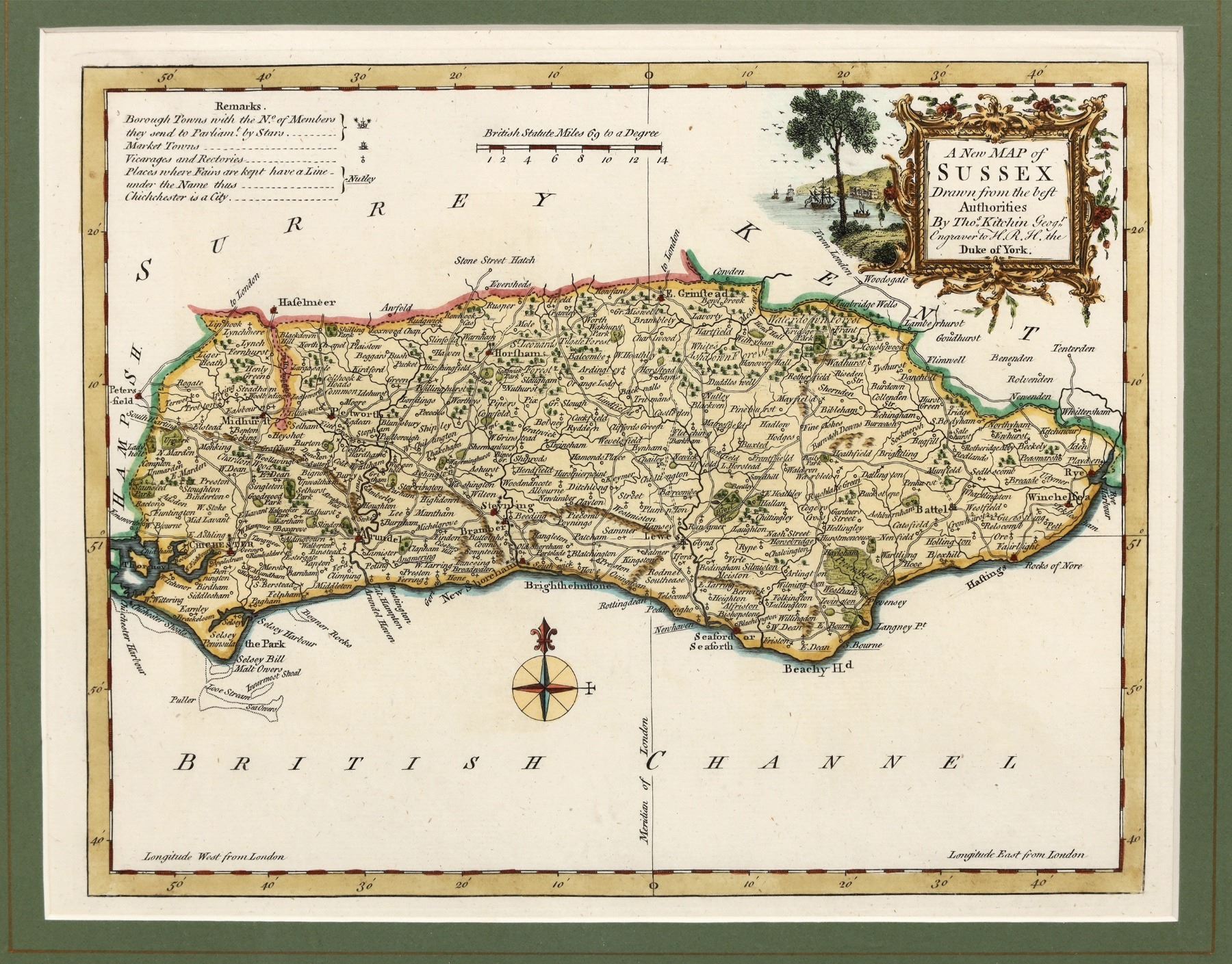 This is a map of Sussex drawn by Thomas Kitchin in 1763 and engraved by the Duke of York. Framed and matted at 15.5 in. X 18 in. The map at 8.25 in. X 10.25 in. Note that all measurements are taken from Zero longitude off of London (due north). Please see photos for details.