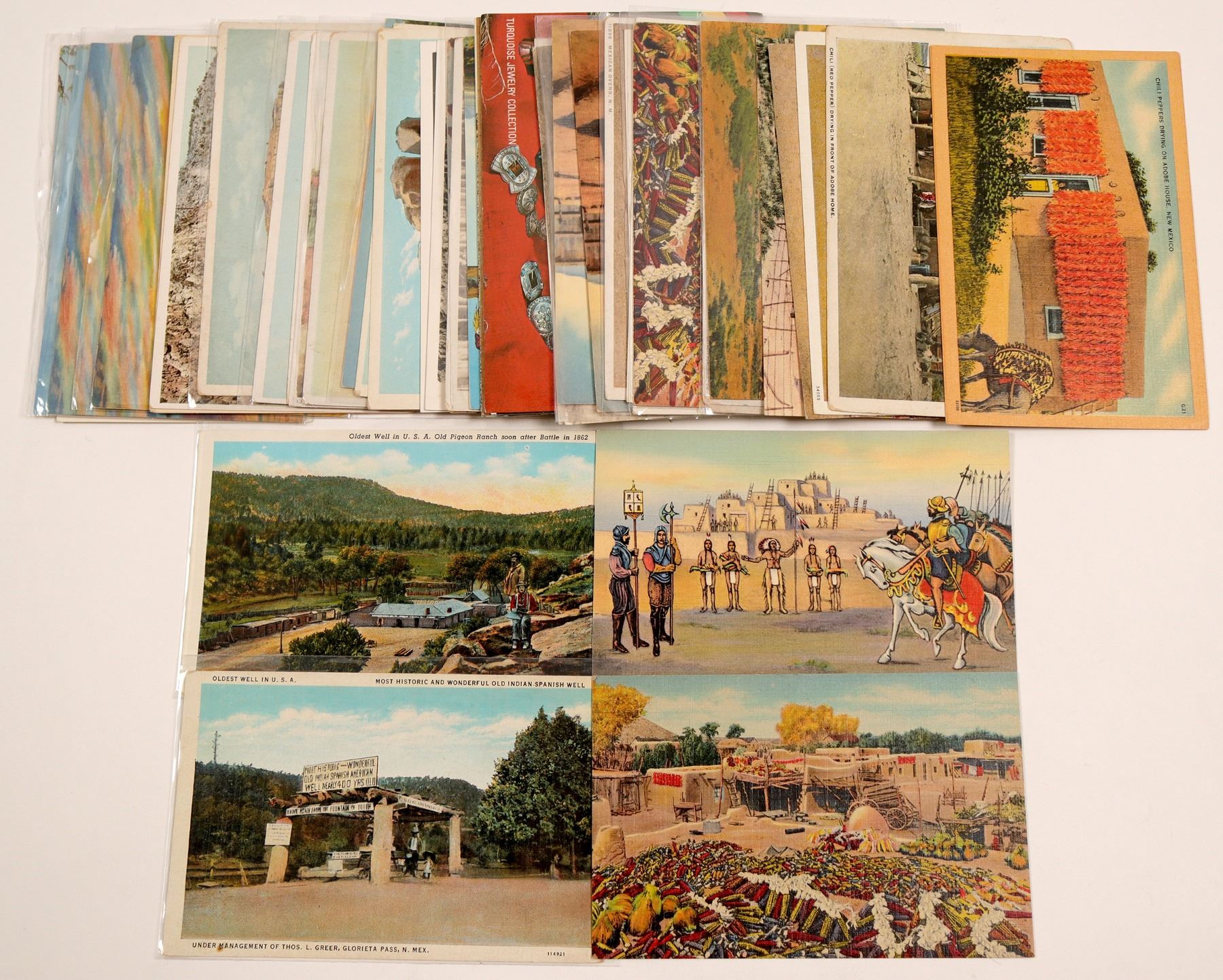 40 New Mexico postcards plus Indians of New Mexico postcard booklet. Pictures include many interesting geological formations, ovens, chili pepper and historic scenes.