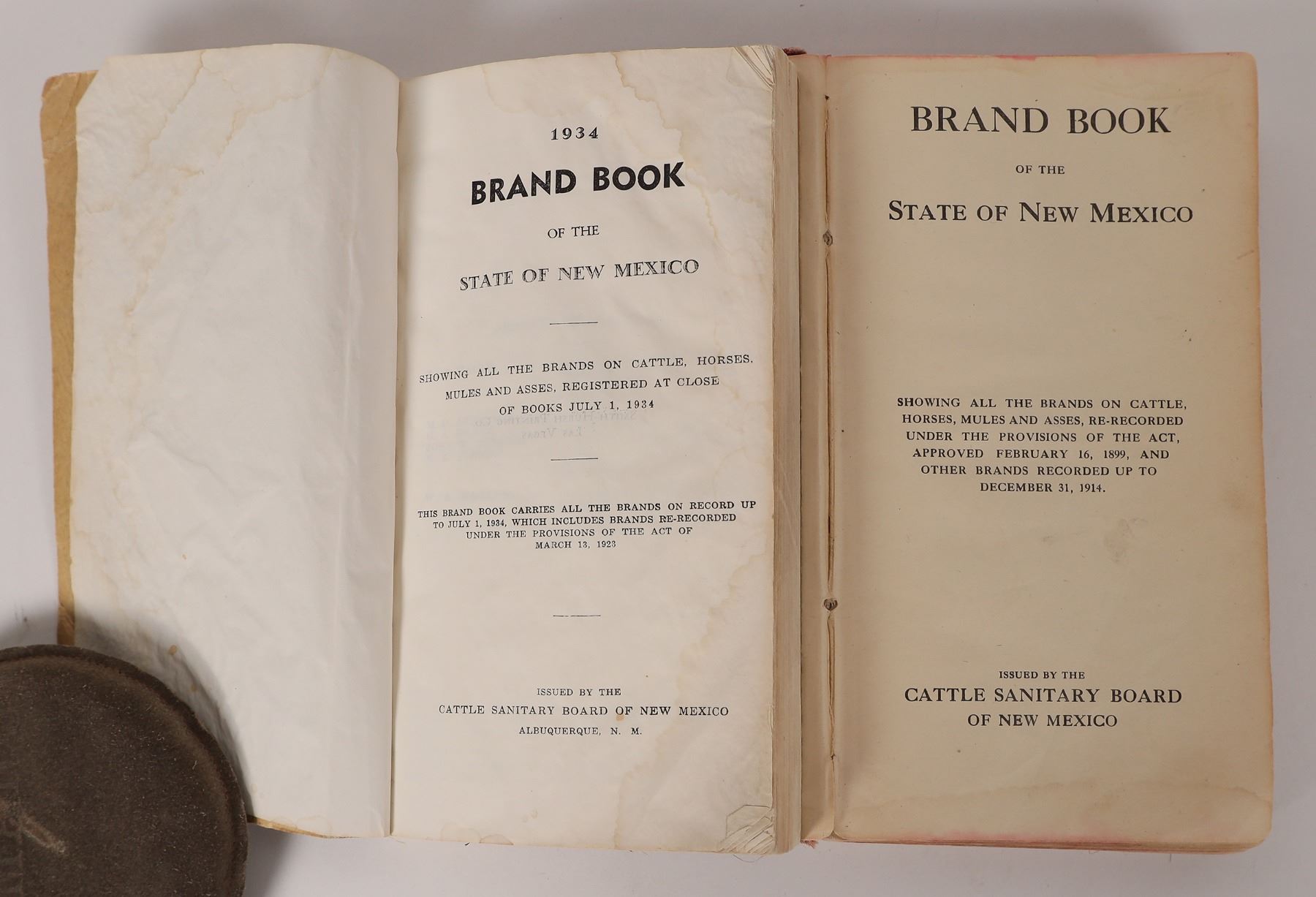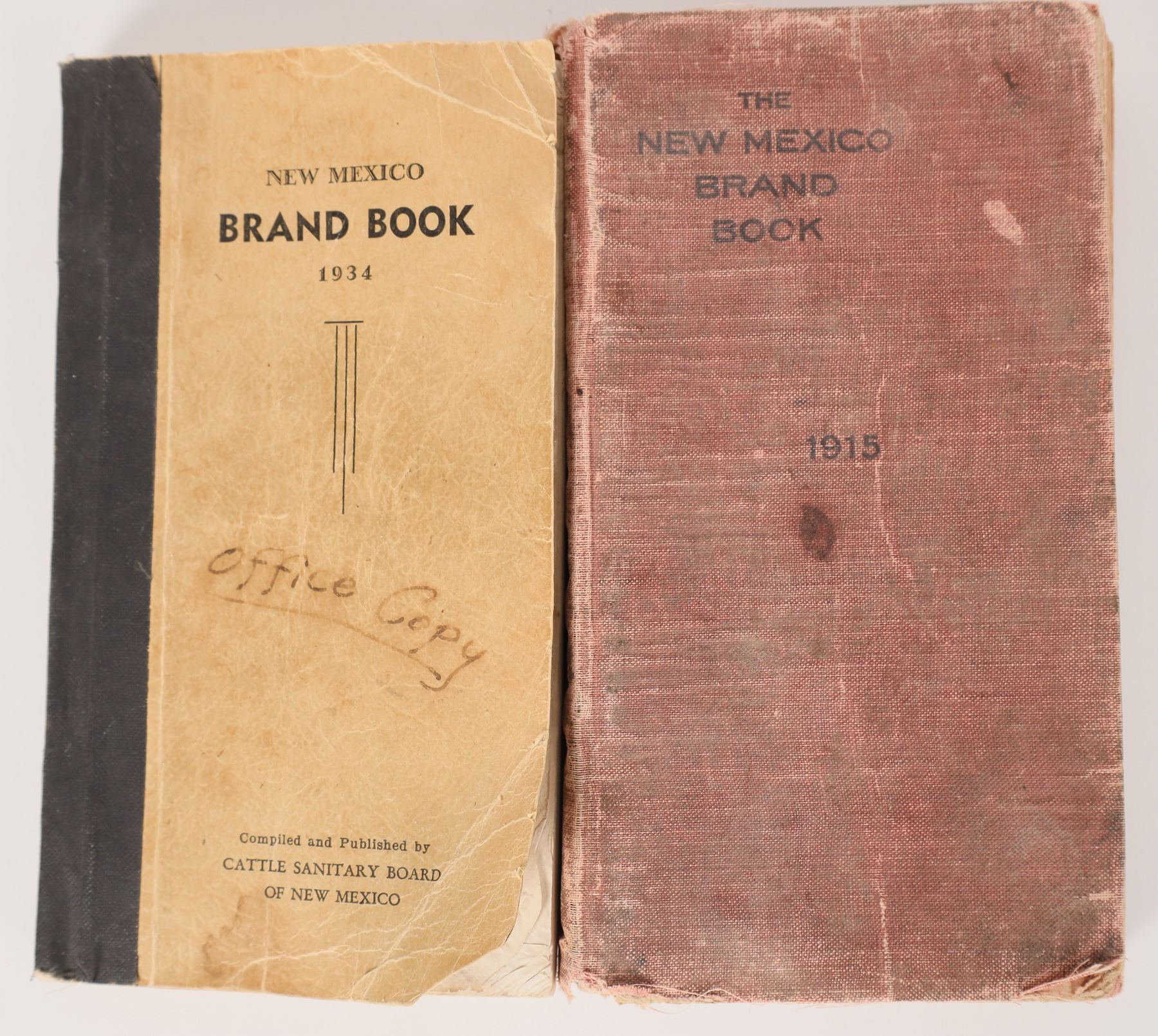 2 New Mexico brand books. Hardcover 1915, cover has wear, pencil writing inside verso board. Softcover 1934. Front cover has lower right chip and Office Copy on cover. Light water stain on front lower right corner and the first few pages. Please inspect. New Mexico