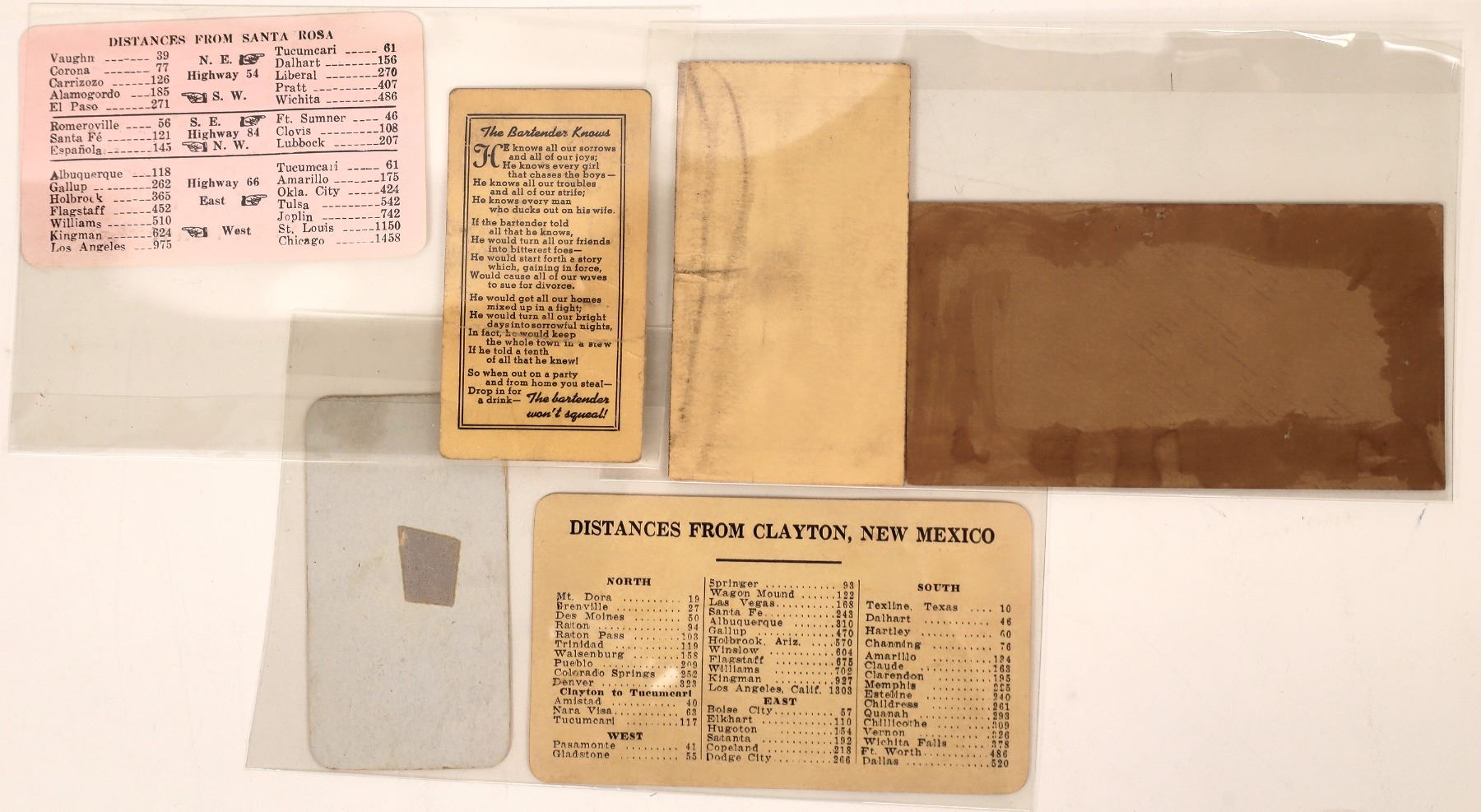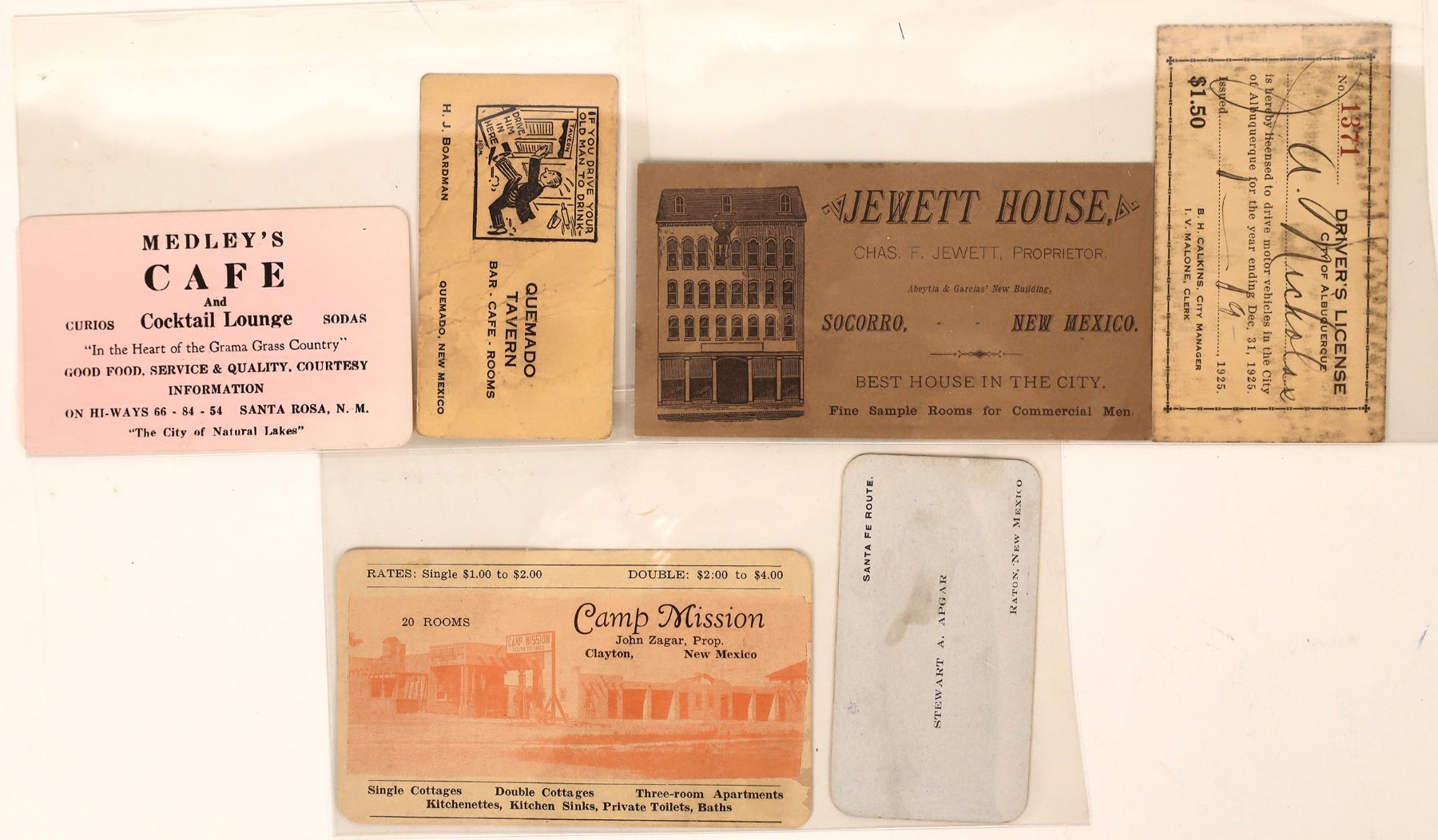 Lot of six rare New Mexico business cards: 1) Stewart A. Apgar / Santa Fe Route/ Raton, New Mexico; 2) Camp Mission / John Zagar, Prop. / Clayton; 3) A. Nickolas 1915 City of Albuquerque driver's license; 4) Jewett House / Chas. F. Jewett, Proprietor / Socorro; 5) Quemado Tavern / Quemado (If you drive your old man to drink - drive him in here); 6) Medley's Cafe and Cocktail Lounge / Santa Rosa. New Mexico