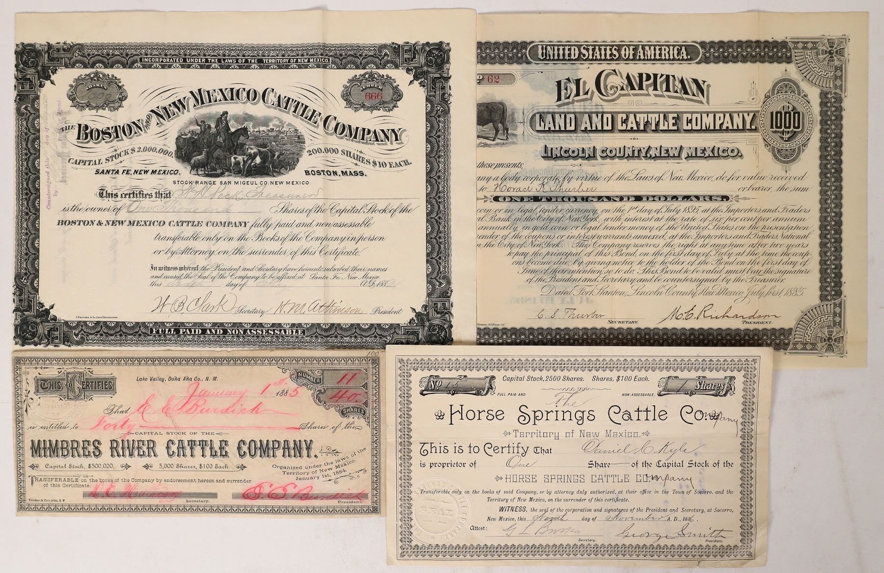4 New Mexico cattle company stocks, all issued. 1882 Boston and New Mexico Cattle. # 666 for 1000 shares to GH Peck treasurer. Signed by HB Clark and HN Atkinson president. Dateline 1882 Santa Fe. Offices in Boston and Santa Fe. Not cancelled. Cattle Drive vignette above a large town. J Knauber printer of Milwaukee. Cut short on left. No edge, corner pin hole or discoloration issues. Extra fine. Atkinson and his company were heavily involved in land grant speculation in the territory. Atkinson was New Mexico's surveyor general at the time. "Atkinson proved to be more corrupt than Proudfit (previous surveyor general). He entered into investment relationships with land grant attorneys, purchased deeds for land grants under consideration by his office and actively recruited buyers for land grant investments." [Natural Resources Journal, Land Grant Speculation in New Mexico during the Territorial Period by Correia]. Horse Springs Cattle, 1886. Mimbres River Cattle, # 11 for 40 shares to EE Burdick. Signed by DE Hathaway and president EE Burdick. Organized January 1, 1884. Incorporated July 7, 1885. Dateline 1885. Location Lake Valley,Dona Ana County. Not cancelled. Crocker & Co San Francisco printer. Red ink has run. Small stains and nicks at borders. By 1890 the Mimbres owned a home range in Grant County and also additional acreage in Lake Valley. The Lake Valley property was excellent rangeland. Burdick was described as a pioneering mining and cattleman in New Mexico in his obituary. El Capitan Land and Cattle. # 62 for $1000. Dated Fort Stanton, Lincoln County, New Mexico, July first, 1885. Issued to Horace K Thurber. Countersigned by Thurber. Thurber was said to have "The heaviest grocery firm in the United States" in 1885 [Las Cruces Sun-news] Issued and uncancelled. Black on white with large steer on upper left with ornate title to right. Cut unevenly at bottom. Today the El Capitan Land and Cattle has 27,000 acres valued at $13,250,000! (This certificate only has collector value!) New Mexico