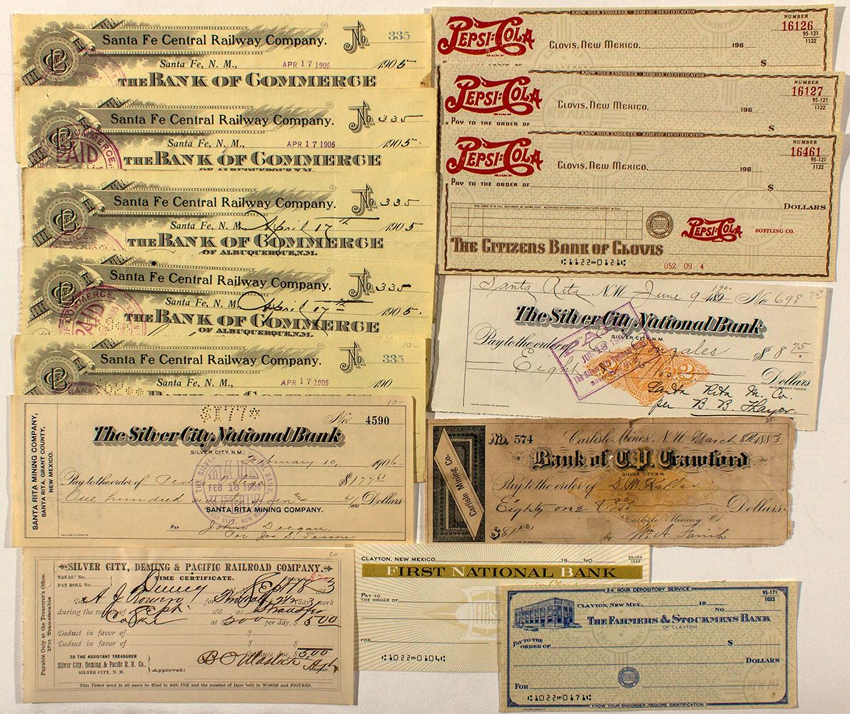 Lot of 14. Includes: an 1883 time certificate for Silver City, Deming & Pacific Railroad Co.; five checks (1905) from the Santa Fe Central Railway Co.; an 1883 Carlisle Mining Co. check, Carlisle Mines, N.M. with RN-D; a 1906 check from the Santa Rita Mining Co. in Silver City; a 1900 draft (RN-X) from the same company; three unused checks from Pepsi-Cola in Clovis (196-); and two unused modern checks from Clayton. (Prag Collection)