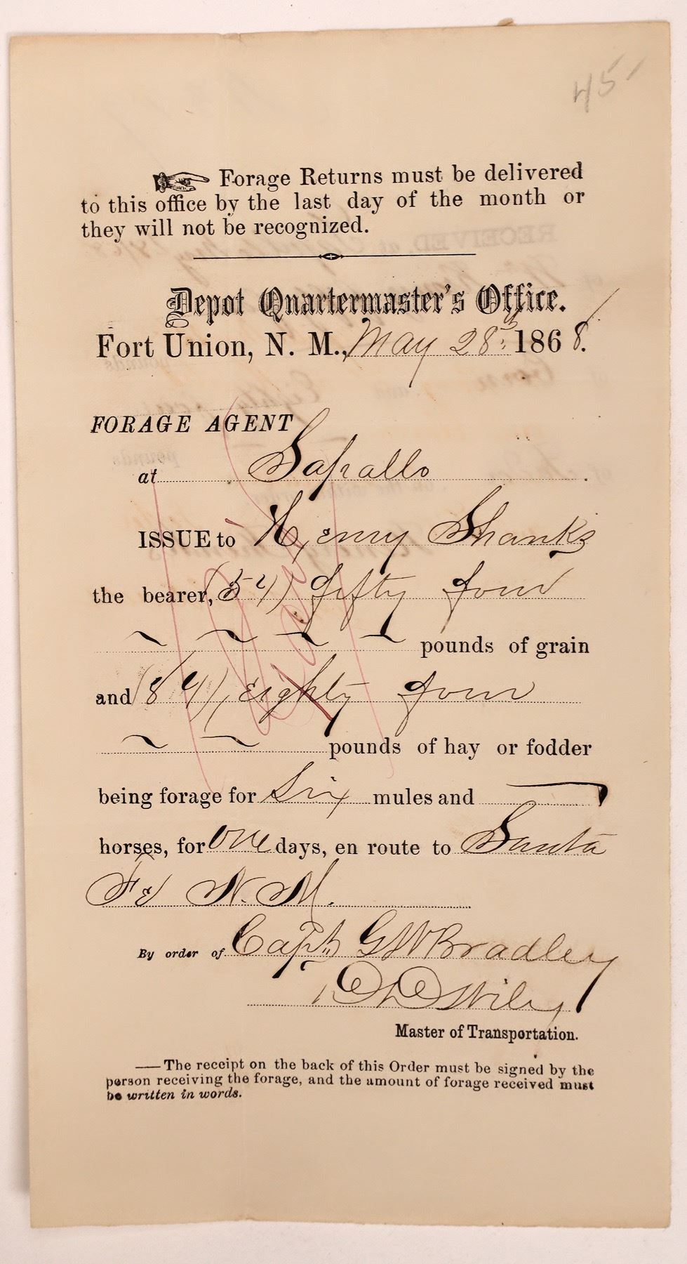 1868 Depot Quarter Master's Office receipt for corn and foder. State:New Mexico City: Date:1868 Provenance: