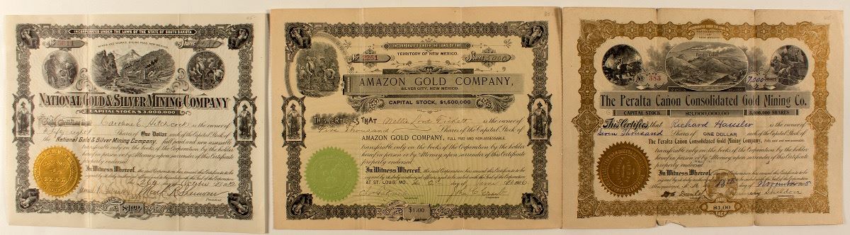 Three New Mexico stock certificates from: The Peralta Canon Consolidated Gold Mining Co., 1905, No. 383, issued by Chauncey Sheldon, President. Issued to Richard Haessler. Uncancelled. Amazon Gold Company, Silver City, New Mexico, 1906, No. 2251. Issued by John C. Eraib, President. Issued to Nellie Lord Fickett. Uncancelled. National gold & silver Mining Company, 1912, No. 5611. Issued by Mark R. Sherman, President. Issued to Caroline E. Hitchcock. Uncancelled. City: State: New Mexico Date: 1905, 1906, 1912 ID# 23842