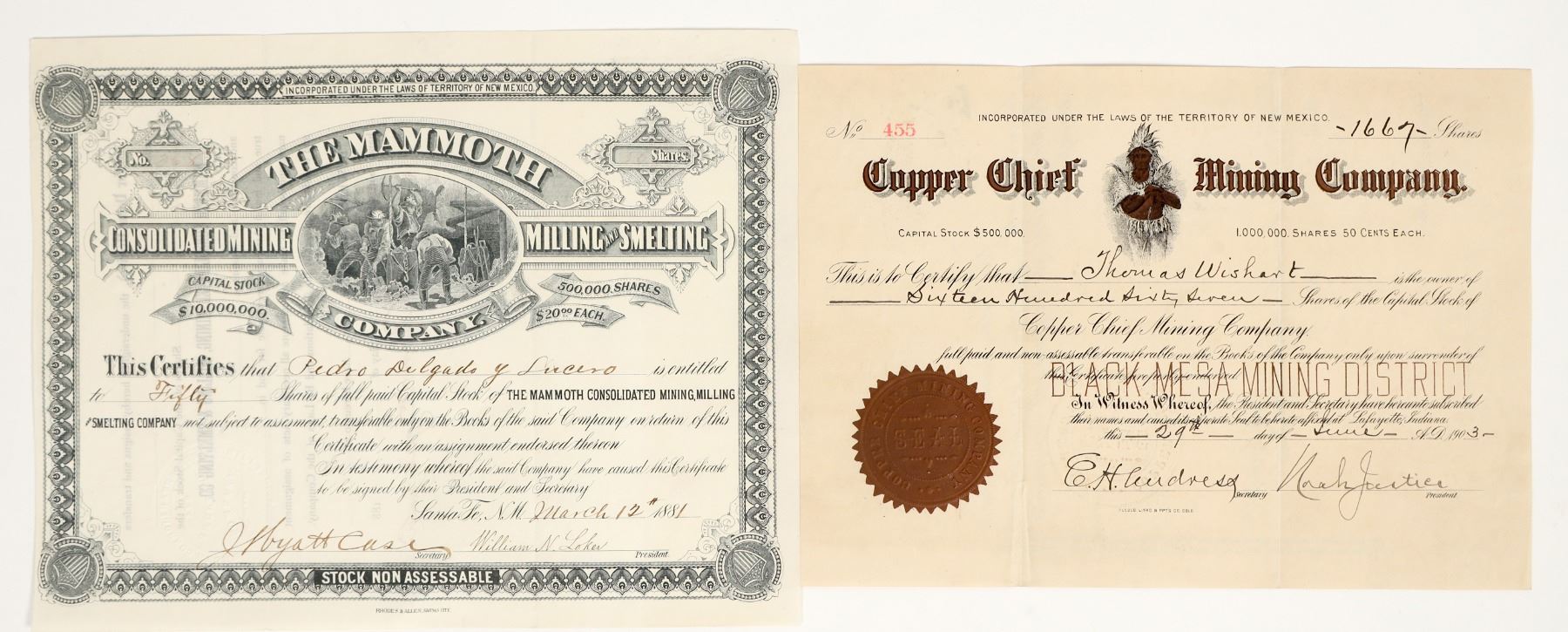 Lot of 2 different. 1) Copper Chief Mining Company. Inc. in New Mexico. "Black Mesa Mining District" underprint. This company operated in the Black Hills Range 3.5 miles southeast of Jerome, Yavapai County. Issued in 1903, not cancelled. Colorized Native American chief vignette. 2) Mammoth Consolidated Mining, Milling & Smelting Company. This company owned the famous Delgado Mine at New Placers near Golden, Santa Fe County. It is made out to Pedro Delgado y Lucero in 1881. Famous territorial figure Juan Delgado wrote that his father lived at the New Placers about the year 1843, giving his name to the Delgado mine. "The ground at the New Placers is very rich with gold. I have taken out of the Delgado mine nuggets of gold worth from $2 to $9 in pure gold. I have kept store at the New Placers and have seen great quantities of gold that were taken out of them. I purchased from the miners in 1876 and 1877 about $300 per month of gold taken out of them." The run of this famous mine finally ended when the company was dissolved in 1921. Underground mining vignette.