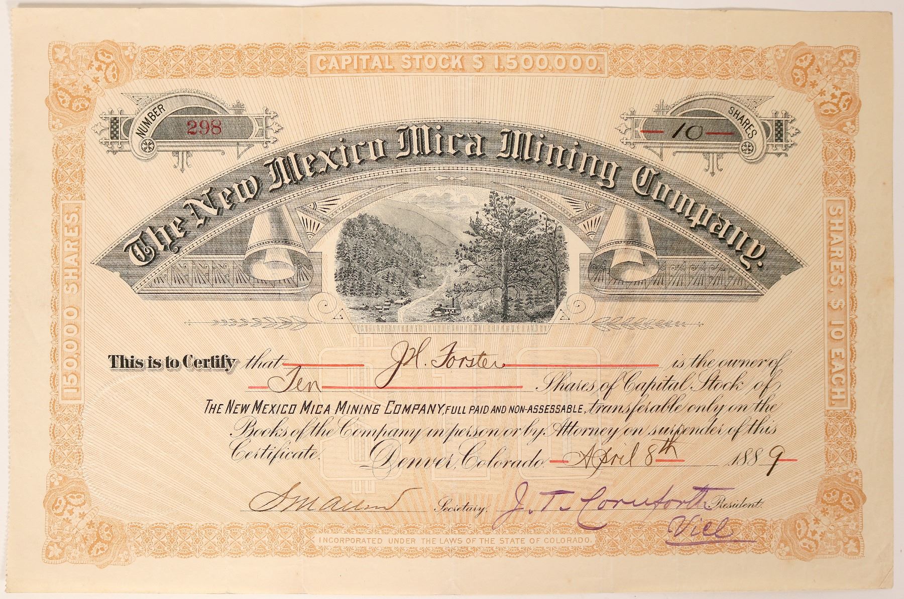 # 298 for 10 shares to JH Foster. Signed by SM Allen and JT Cornforth vice president. Dateline Denver 1889. Not cancelled. Mountain valley vignette in an arched window. Vertical folds. Otherwise no apparent issues. In 1888 the company planned to pulverize the mica for use in wall paper and lubricants. Ken Prag Collection