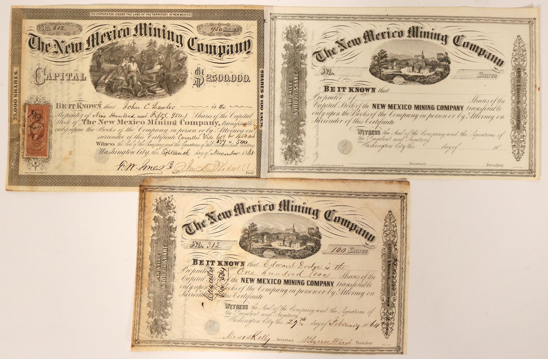 Lot of three. 1) 1868 stock # 612 for 950 shares to John C Lawler.Signed by F Jones and president Jonathan Bidwell. Sluicing vignette. Incorporated in New Mexico. Discoloration (mostly left side). 2) 1864 stock #312 for 100 shares to Edward Dodge. SIgned by Moses Kelly and president Ulysses Ward. Idyllic village vignette. Discoloration mostly left. Cancelled and re-issue as stock # 504. 3) Unissued 1864 stock certificate. "In 1856, a rich placer deposit was discovered at Pinos Altos near Bear Creek, northwest of Silver City. It was so rich in gold that miners made $40 to $50 per day just panning gold. Within three months of its discovery, one thousand prospectors had come to live and work there. The mine at Bear Creek became the first corporate mining company to form in New Mexico. Miners at Bear Creek used rockers, sluice boxes, and "long toms" along with their gold pans to separate gold from the rock. Gold-bearing ore was crushed in mills (arraste) and also extracted from retorts. In retorts, mercury captures the gold, and the gold is left after the mercury is boiled to a vapor. This process was done with a minimum of expenditure, but it killed the brain cells of any miner who breathed the mercury fumes. The mill at Bear Creek closed three years after it opened. Miners ventured downstream to the San Vincente Creek Arroyo, where Silver City lies today, and found a rich silver deposit. There, at Chloride Flat, miners found horn silver, silver chloride. They named the mine, the Legal Tender, and this silver mine burrowed anywhere from 50 to 200 feet below the surface. Martin Beaman, a miner Page 3 of 3 who had a sawmill and experience using a steam engine, established the ore mill. The first miner of Silver City, he had purchased the equipment used at Bear Creek for scrap. The Legal Tender mine produced $2 million in two years with its high grade silver ore. In 1894, the market for silver suffered a devastating crash, and silver fell from one dollar per ounce to thirty-nine cents per ounce." from Evelath et. al. Ken Prag Collection