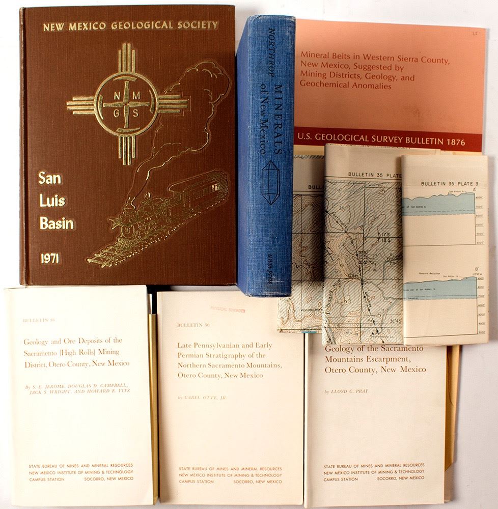 Books, maps, and a USGS publication pertaining to New Mexico mining and Geology. Date: Location: New Mexico HWAC# 56551
