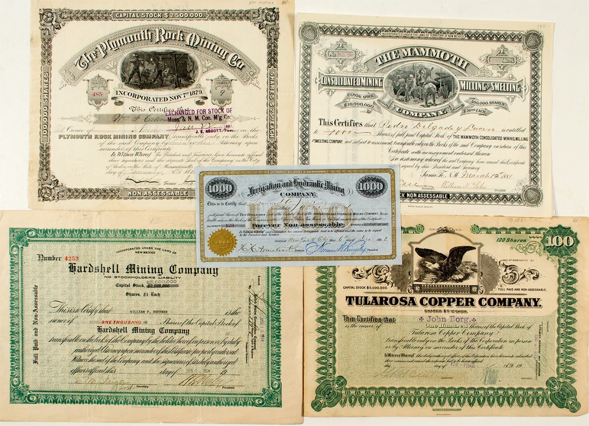 Lot of five different. 1) Irrigation & Hydraulic Mining Company. Issued 1893 in New York. Not cancelled. Blue paper with gold border and seal. Very clean! 2) Hardshell Mining Company. Issued 1924. Not cancelled. Green border. No vignette. Folds and light soiling. 3) The Plymouth Rock Mining Company. Issued 1880 in Boston. Stamped exchanged. Nice underground mining vignette. Folds and wrinkles. 4) The Mammoth Consolidated Mining, Milling & Smelting Company. Issued 1881 in Sante Fe. Not cancelled. Vignette of miners underground. Folds. 5) Tularosa Copper Company. Issued 1911. Not cancelled. Green border and eagle vignette. Folds with soiling. (Prag Collection) City: State: New Mexico Date: 1880-1924 hwac# 34072