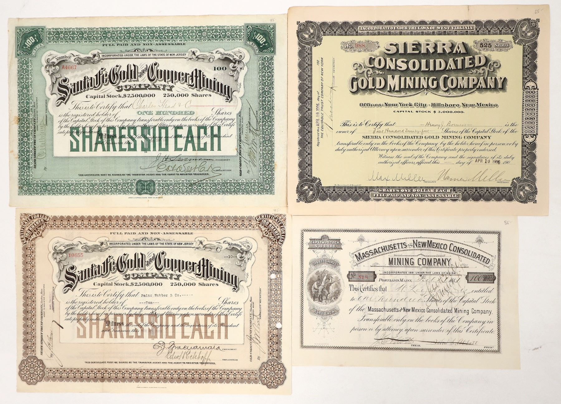 Issued-1881 Massachusetts and New Mexico Cons., 1906 Sierra Cons. Gold-1" lower right crease tear., 1907 and 1915 Santa Fe Gold and Copper-several small stains on 1907.