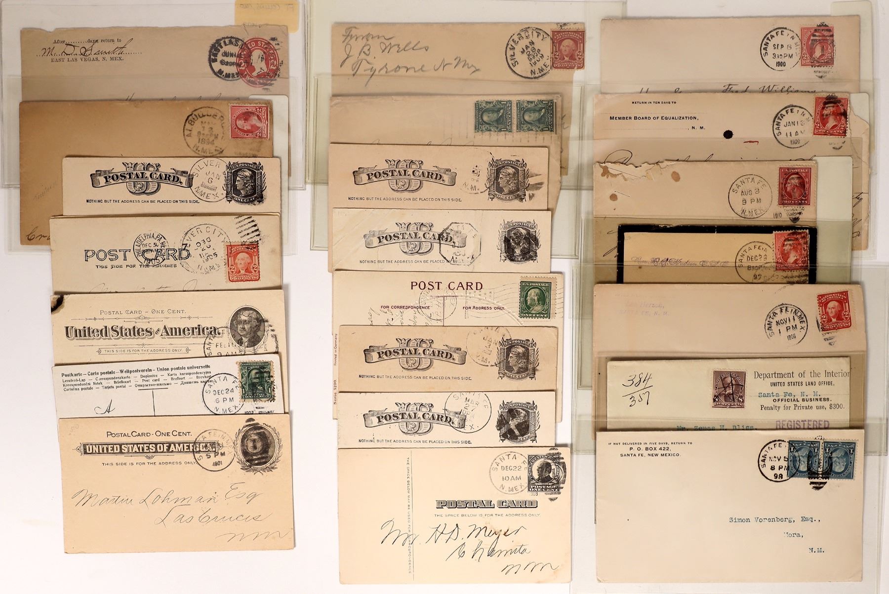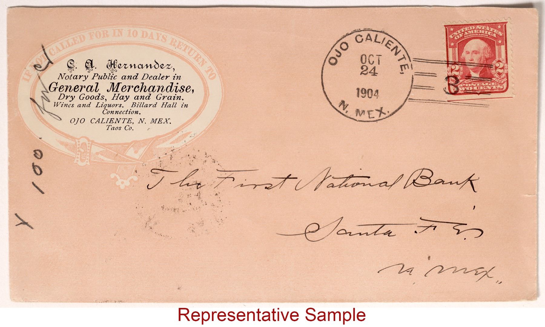 Lot of 23. Premier piece is a perfect 1904 Ojo Caliente, Taos County. Also it has a corner advertisement for CA Hernandez, notary public and dealer in general merchandise. Doane ë3' four bar cancel. Sweet. Also East Las Vegas, Albuquerque, 4 Silver City and 16 Santa Fe.