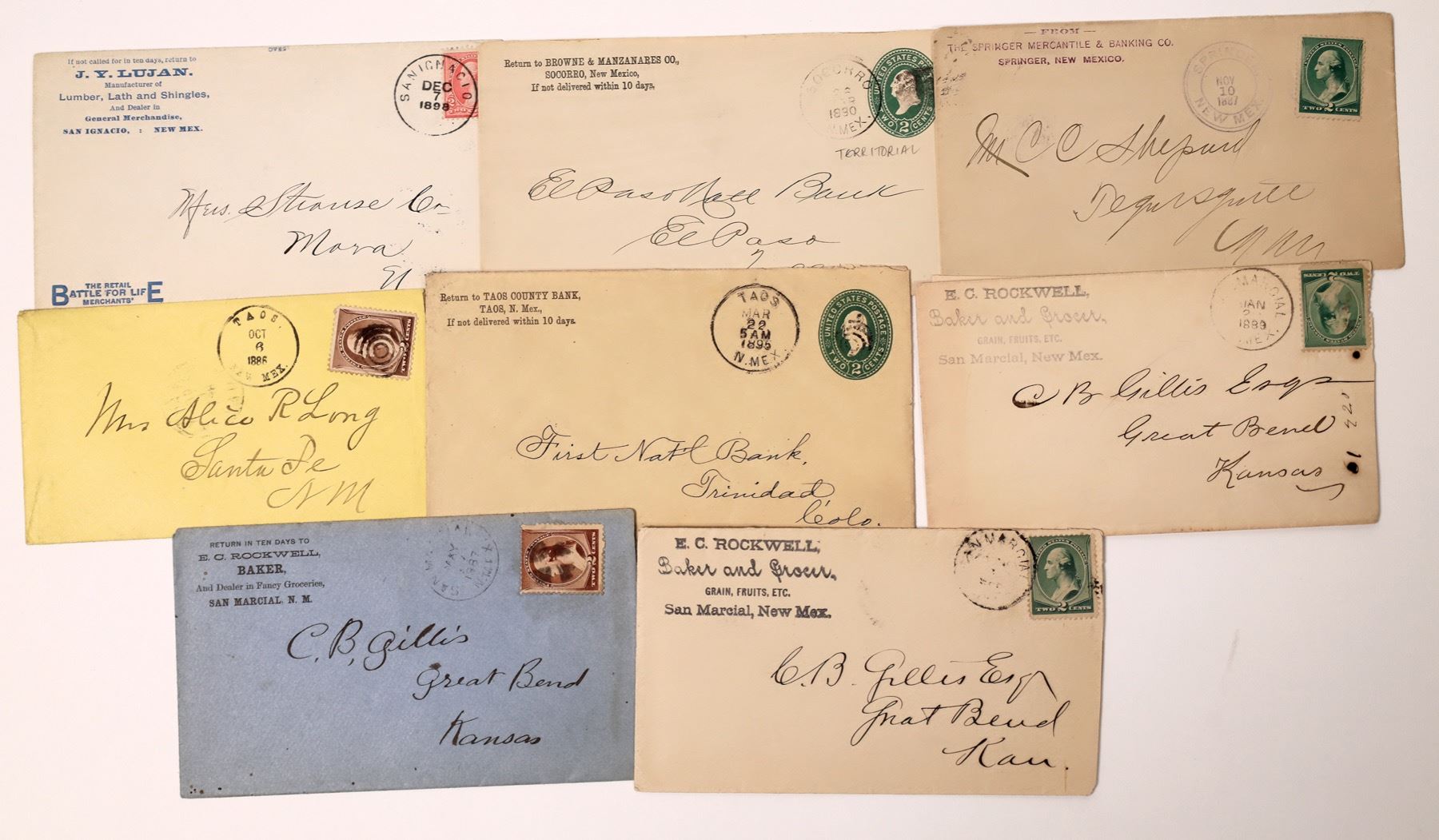 Lot of eight – all with corner advertising. 1-3) San Marcial. Rockwell Baker and Grocer, 1889. 188- Rockwell grocer. 4) San Ignacio. Post office open from 1886-1901. This is an 1889 cancel type 3 from JY Lujan lumber. 5-6). Taos. 1895 Taos County Bank. 1886 cover. 7) 1887 Springer mercantile. Double ring/double circle. 8) 1890 Socorro.