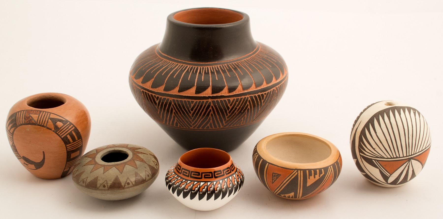 New Mexico Pottery: 1) Larger pot by MS from Acoma Pueblo. Etched pot, bear image, 3.5" high x 4" diameter. 2) B. Conejo, small seed pot. 3) Hopi artist, James Nampeyo. Miniature pot 2" diameter. 4) Hopi artist, Camelia Dewakuku. Snake design seed pot 1.75" high x 2" diameter. 5) Miniature pot--J.F.G., Jemez Pueblo. 1.75" diameter. 6) miniature pot by Teadora, Ortiz, Mexico. State:New Mexico City: Date: ID# 48172