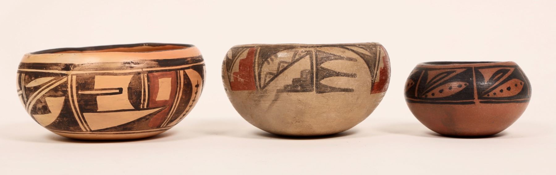 Probably from three different pueblos. 1.) The oldest of the three. 5 1/4" diameter, 3 1/4" tall, c1900-20 2.) 5 3/4" diameter 3" tall, signed by Chief Joe June 1956 Holbrook Arizona 3.) Small bowl 3 7/8" x 2 1/2" tall, c1960