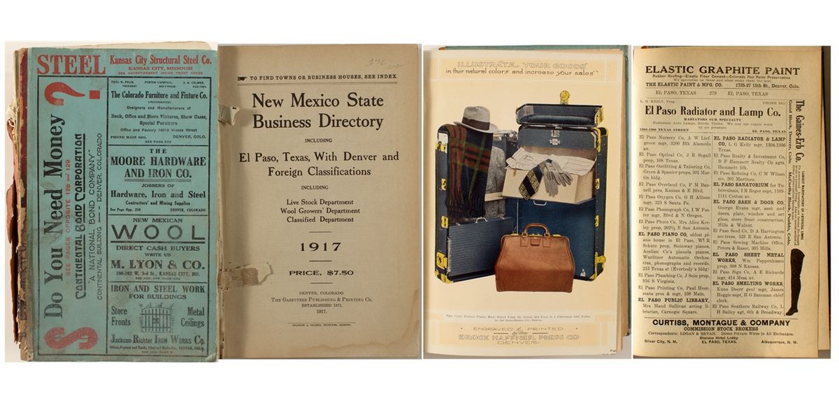 Including El Paso, Texas, With Denver and Foreign Classifications. The Gazetteer Publishing & Printing Co., Denver. Calhoun & Holmes, Printers. 1917. 859 pages. General Index by category, Index (alphabetical) of cities and towns, index to advertisements. Condition: Front board and first eight pages of advertisements detached, but present. Spine cover detached, but included. Rarity: [i]City: County: State: NMDate: