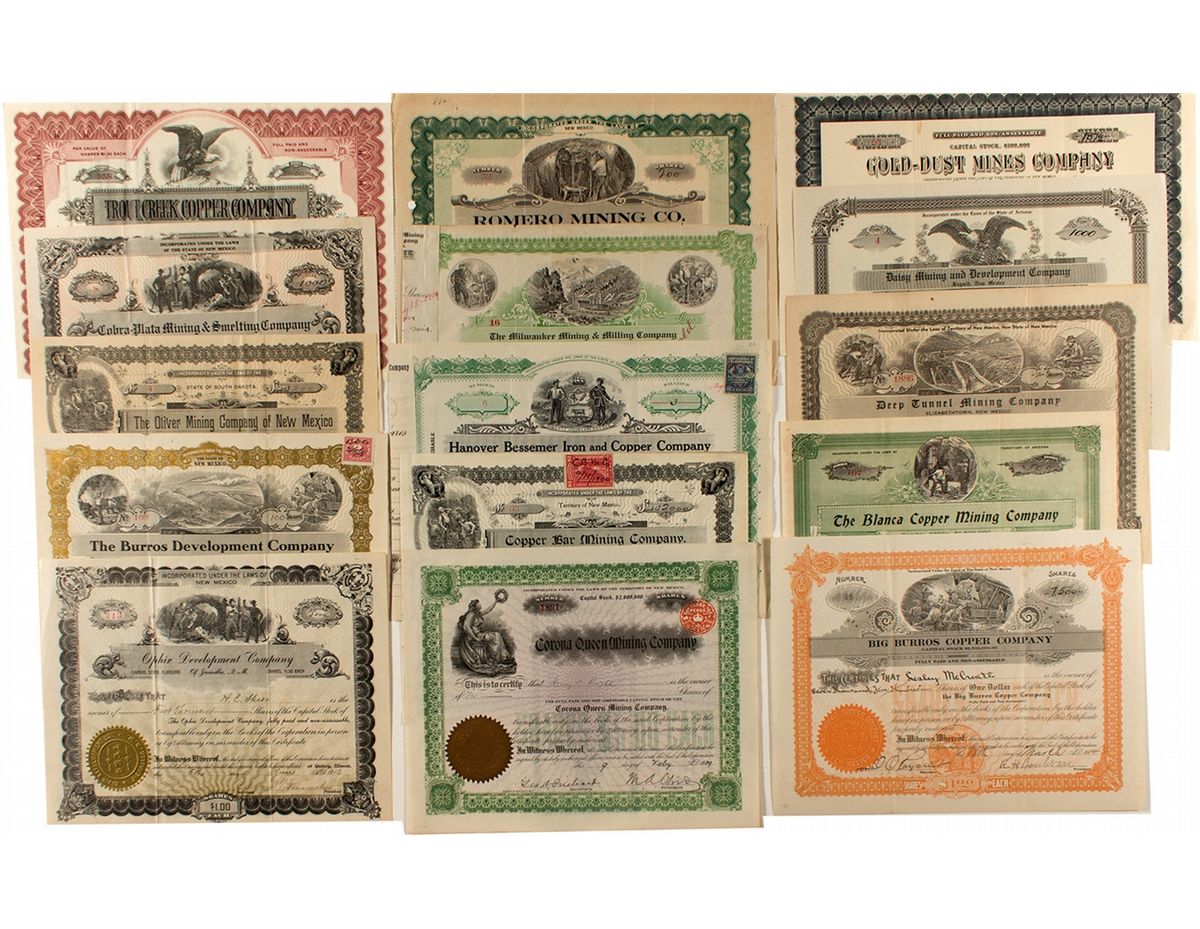 Fifteen issued New Mexico mining stocks from around the state. A nice collection. 1)The Milwaukee Mining & Milling Company, issued 1915. Tucumcari, New Mexico. Pen cancelled. 2)Deep Tunnel Mining Company, issued 1933. Elizabethtown, New Mexico. Unc. 3)Daisy Mining & Development Co., issued 1913. Bayard, New Mexico. Unc. 4)Hanover-Bessemer Iron & Copper Co., issued 1914. Operated at Fiero, N.M. Hole cancels, part of stub glued at left edge. 5)Copper Bar Mining Company, issued 1900. Operated at Organ, Dona Ana County (1908 Copper Handbook). Rev. stamp. Pen cancelled. 6)Ophir Development Company of Jicarilla, N.M. Inc. in New Mexico. Issued 1916. Unc. 7)The Blanca Copper Mining Company, issued at Denver in 1906. Offices in Silver City. Had 3 claims in the Bear Mtn. district, 8 miles from Silver City. Unc. 8)The Burros Development Company, issued 1918. Inc. in New Mexico. Operated at Leopold, N.M. Offices were in Silver City. 9)Big Burros Copper Company, issued 1914. Inc. in New Mexico. Large mining vignette. Unc. 10)Corona Queen Mining Company, issued in 1909. Offices at Corona, Lincoln County. Lands in the Red Cloud district (1908 C.H.). Inc. in New Mexico. Three pence British revenue stamp. Unc. 11)Romero Mining Company, issued 1913. The company held 14 claims in the El Porvenir district, San Miguel County (1918 M.H.) Unc. 12)Gold-Dust Mines Company, issued in 1912. Inc in the Territory of New Mexico. There's a Gold Dust mine in Catron County that's an underground gold mine (us-mining.com). Not sure if this was their mine. Unc. 13)The Oliver Mining Company of New Mexico, issued in 1902. Inc. in South Dakota. The co. operated at Chloride, Sierra County in 1902 (Leg. Blue Book of the Terr. of New Mexico, 1905). Unc. 14)Cobra-Plata Mining & Smelting Company, issued in 1917. Inc. in New Mexico. Unc. 15)Trout Creek Copper Company, issued in 1907. Inc. in New Jersey. Eagle vignette. Unc. Most of the certificates are in very good to VF condition.City: County: State: NMDate: