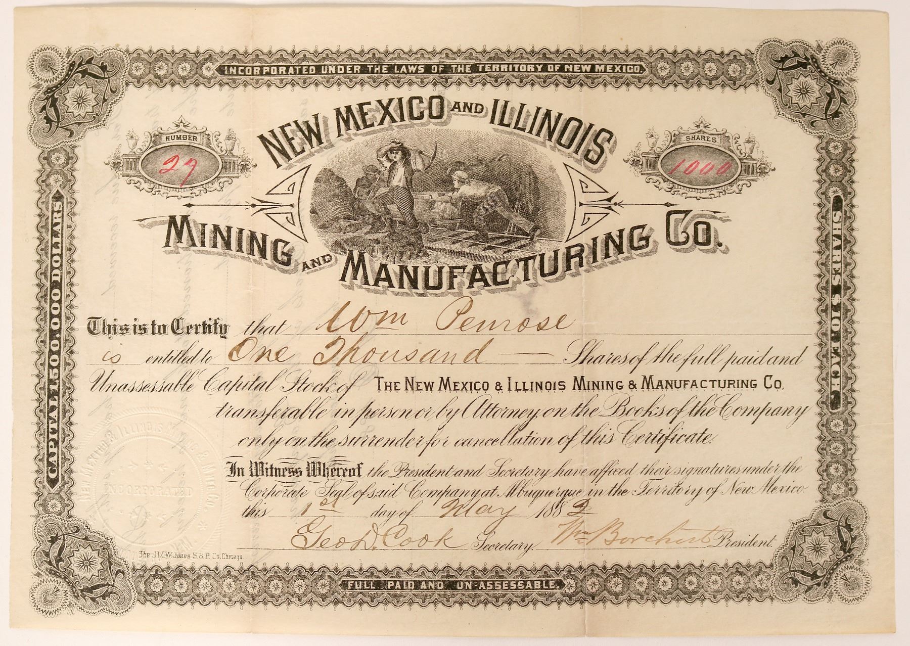 # 27 for 1000 shares to William Penrose. Signed by George D Cook and president William Borchurt(?). Dateline Albuquerque 1882. Not cancelled. Underground mining vignette with miner pusing ore cart. JMW James of Chicago printer. Pin holes. No corner, edge or discoloration issues. This was a coal mining operation organized in November of 1881. It was announced in February of 1883 the company would begin construction on their smelter as soon as the weather permits. Ken Prag Collection