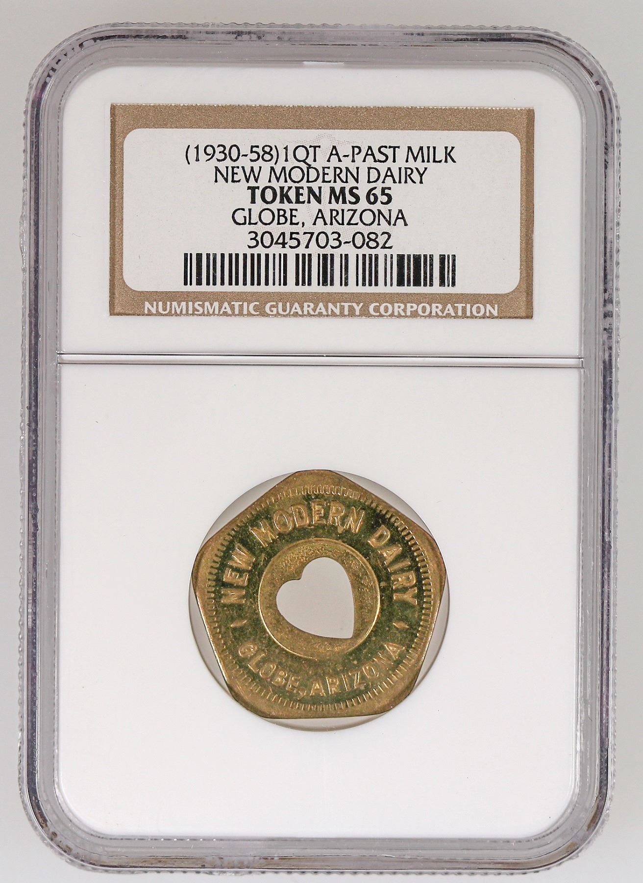 NGC certified MS 65: NEW MODERN DAIRY / GLOBE, ARIZONA // 1 QUART / A-PAST. MILK (heart cutout); Br., Pentagonal, 25 mm.