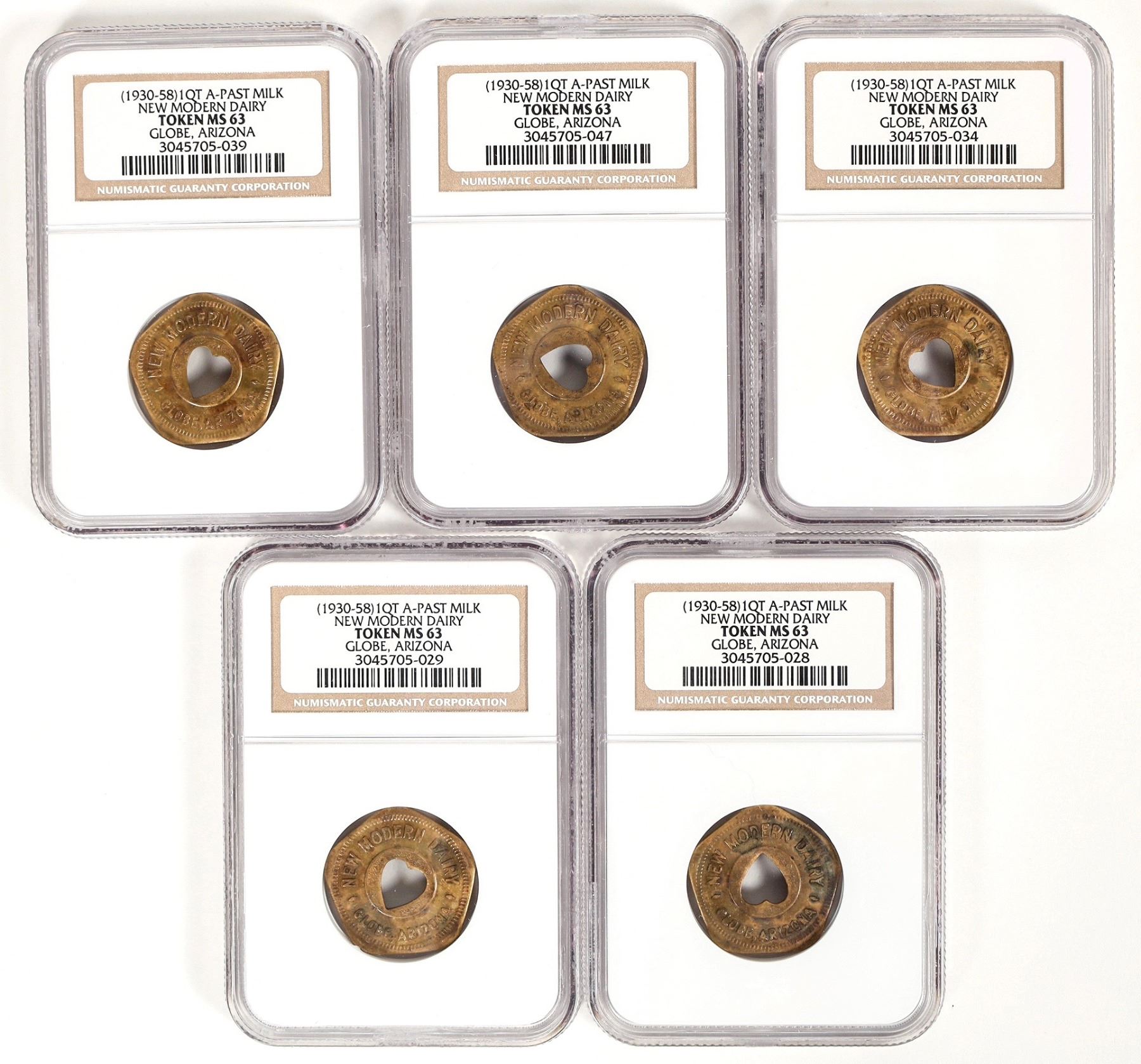 Five NGC graded MS 63 tokens: NEW MODERN DAIRY / GLOBE, ARIZONA // 1 QUART / A-PAST. MILK (heart cutout); Br., pent., 25 mm.
