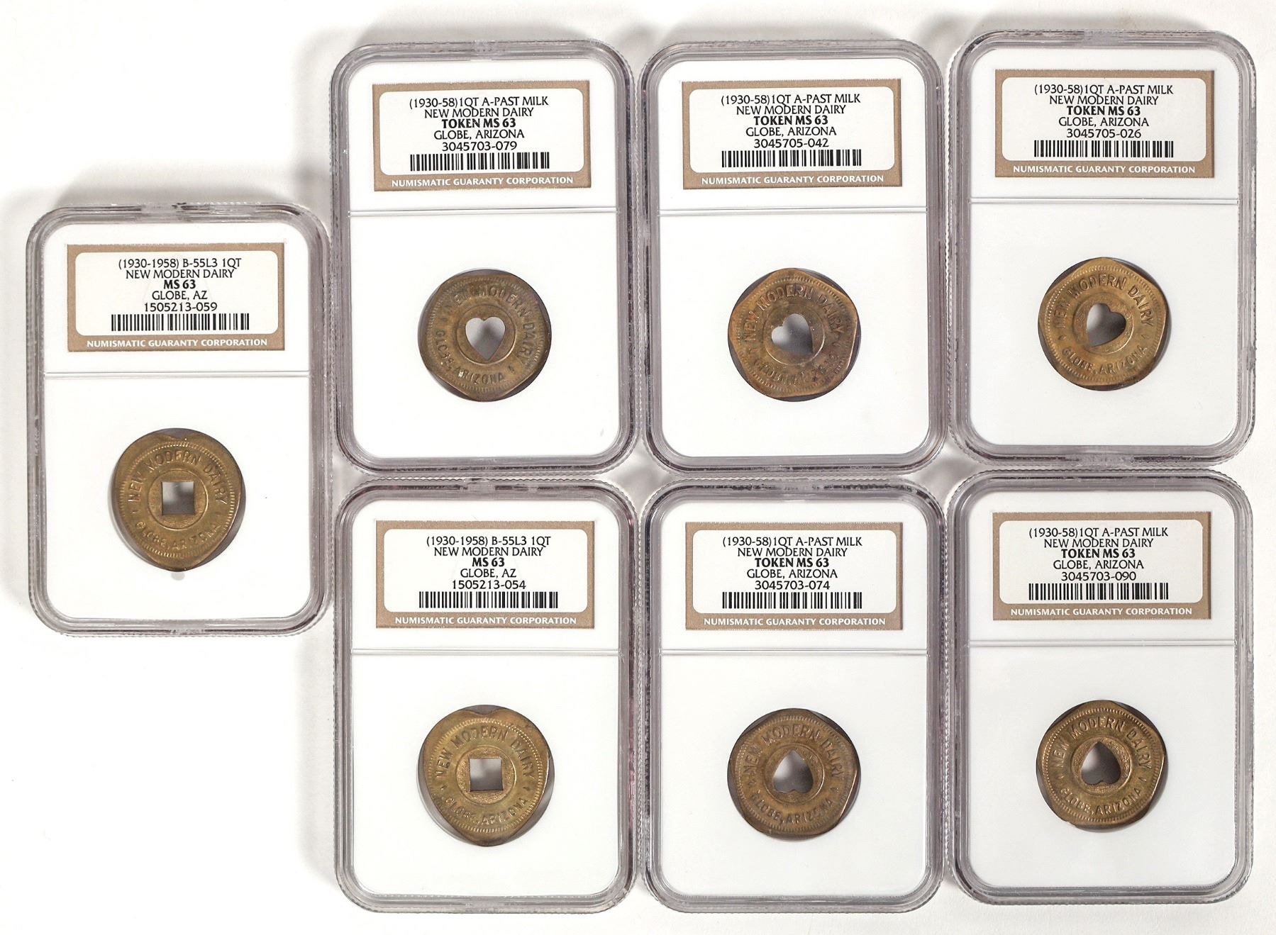 Lot of seven NGC graded tokens all graded MS 63. Two are good for one quart special milk with square cut out; five are good for 1 quart A-Past Milk with heart shaped cut out.
