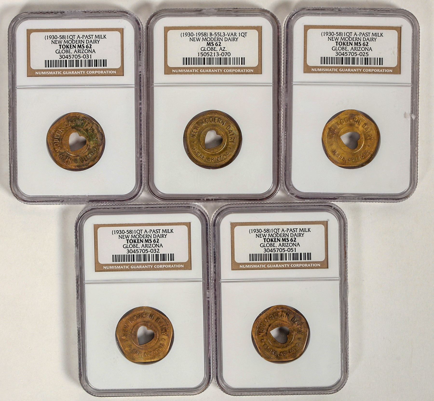 Five NGC graded tokens MS 62. NEW MODERN DAIRY / GLOBE, ARIZONA // 1 QUART / A-PAST. MILK (heart cutout); Br., pent. 25 mm.