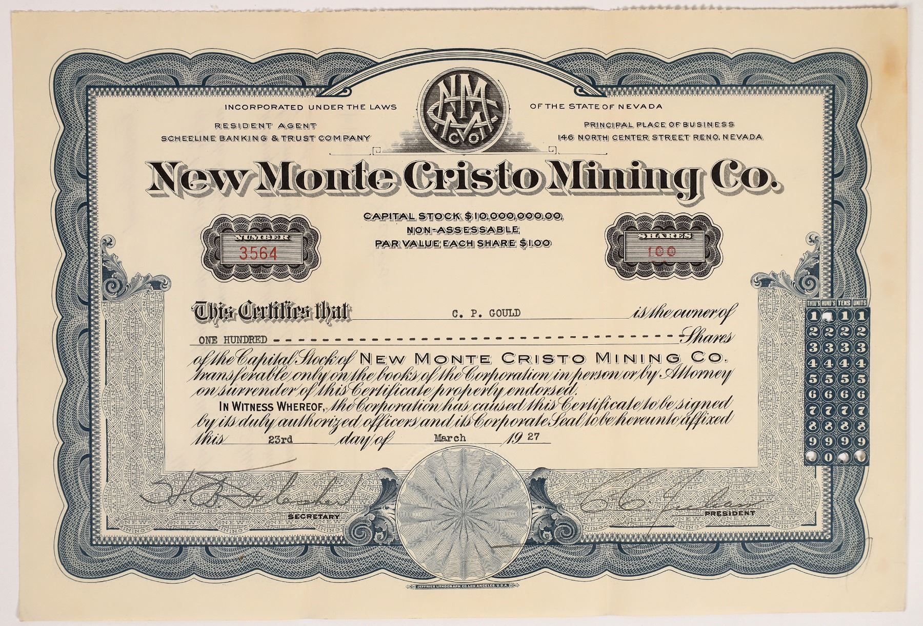 The New Monte Cristo Mining Company's principal place of business was 146 North Center Street, Reno, Nevada. This stock certificate issued in 1927 to CP Gould for 100 hundred shares is signed by president C.C. Julian, the notorious stock swindler. The Los Angeles Julian Petroleum Company sold hundreds of millions of dollars of fraudulent stock to naive investors. Julian sold the company in 1924 to Sheridan C. Lewis and moved to Nevada. Julian had three consecutive firms (Western Lead, Julian Merger Mines and New Monte Cristo Mining) that tried and failed to duplicate the success, short-lived and unsustainable as it was, he'd scored with "Julian Pete." One news article, titled "Julian Back, Vociferating," published in the Los Angeles Times on 27 May 1927, described how the colorful promoter returned and declared his intention to "put the crooks in jail." While he claimed to be protecting the stockholders, the paper pointed out that Julian had a half-dozen schemes that were undertaken with "a consistent and persistent effort to evade the laws provided for the safeguarding of investors." After jumping $25,000 bail, he committed suicide in March of 1934 in Shanghai. Nevada 1927 Ken Prag Collection