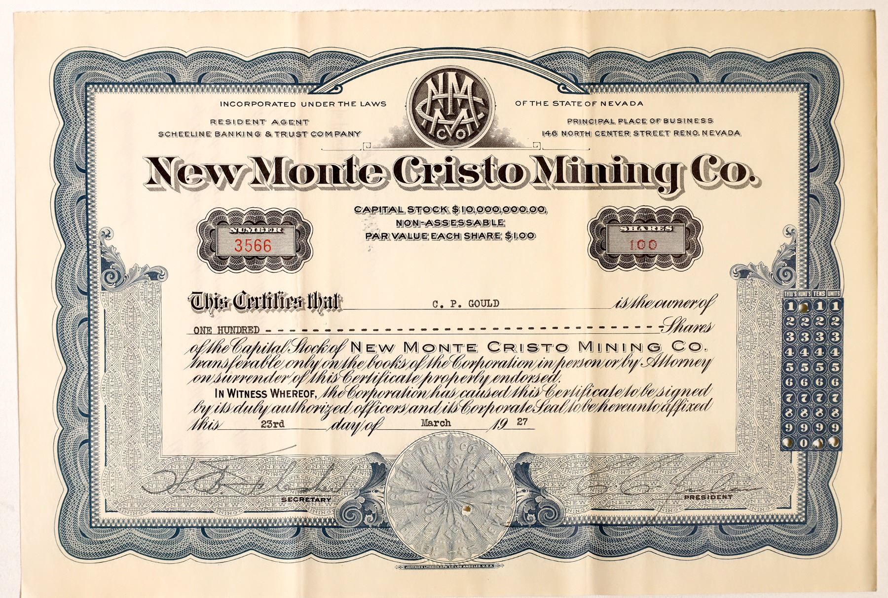 The New Monte Cristo Mining Company's principal place of business was 146 North Center Street, Reno, Nevada. This stock certificate issued March 23, 1927 to CP Gould for 100 hundred shares is signed by president C.C. Julian, the notorious stock swindler. The Los Angeles Julian Petroleum Company sold hundreds of millions of dollars of fraudulent stock to naive investors. Julian sold the company in 1924 to Sheridan C. Lewis and moved to Nevada. Julian had three consecutive firms (Western Lead, Julian Merger Mines and New Monte Cristo Mining) that tried and failed to duplicate the success, short-lived and unsustainable as it was, he'd scored with "Julian Pete." One news article, titled "Julian Back, Vociferating," published in the Los Angeles Times on 27 May 1927, described how the colorful promoter returned and declared his intention to "put the crooks in jail." While he claimed to be protecting the stockholders, the paper pointed out that Julian had a half-dozen schemes that were undertaken with "a consistent and persistent effort to evade the laws provided for the safeguarding of investors." After jumping $25,000 bail, he committed suicide in March of 1934 in Shanghai.
