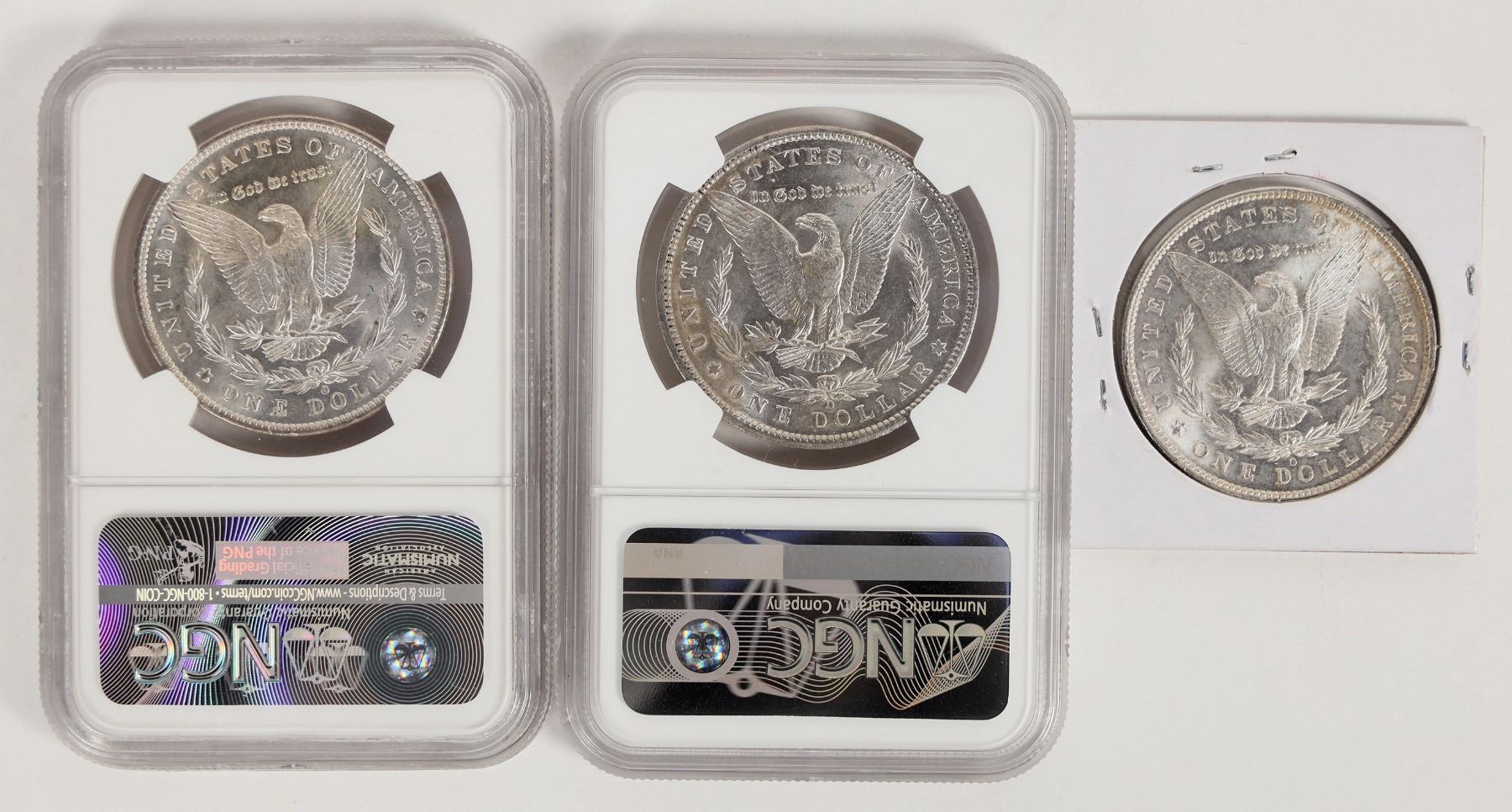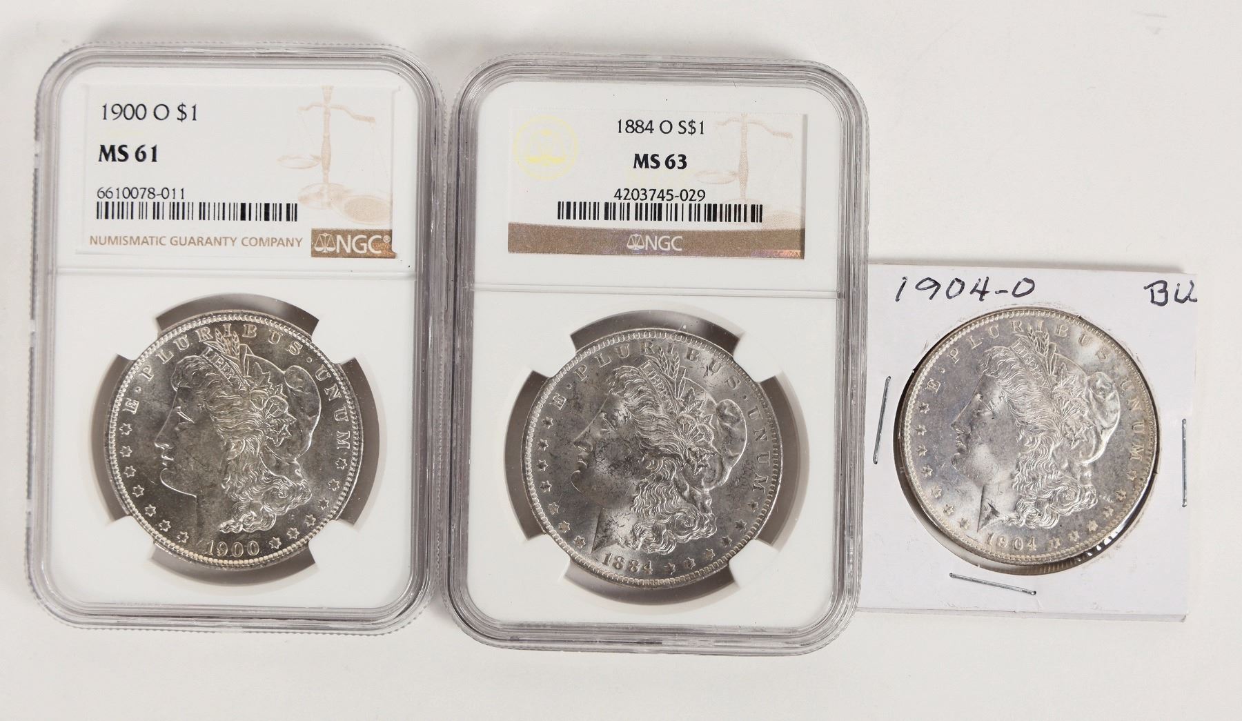 Three uncirculated New Orleans Morgan dollars: 1) NGC graded MS 61 1900-O. 2) NGC graded MS 63 1884-O. 3) Uncertified 1904-O; MS 63 in our opinion.