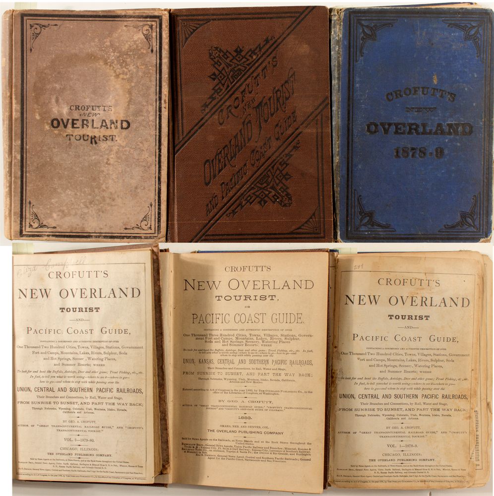 Group of three New Overland Tourist and Pacific Coast Guide, by Geo. A. Crofutt. Contained authentic descriptions of over one thousand destinations such as settlements, government outposts, scenery, and wild life. The Union, Central, and Southern Pacific Railroad lines along with their water and stage branches passed through NE, WY, CO, UT, MT, ID, NV, CA, and AZ. Includes Vol. 1, 1878-79, missing several pages prior to title page, many pages separated from spine. Volume 2, 1879-80 is complete, very good condition. The 1883 volume has some pages with foxing, otherwise very good.