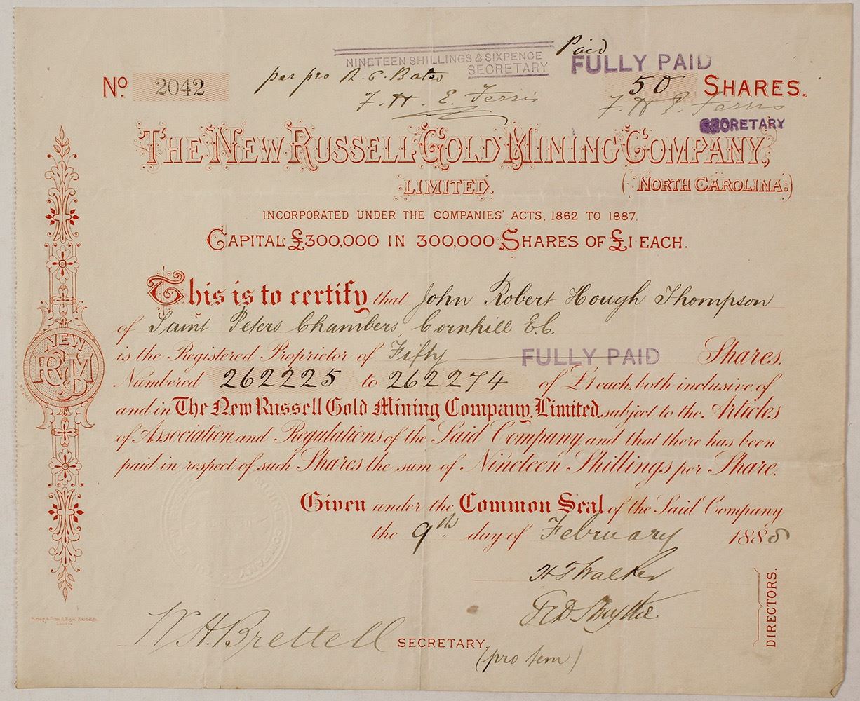 Issued to John Robert Hough Thompson for 50 shares in 1885. Signed by officers. English. Cancelled by rubber stamp. The New Russell Mine was located in Montgomery County. Gold occurs in schists, associated with certain strata rather than in veins or fissures. Miners found it difficult to predict their coccurances and often had to resort to panning to locate paying areas. Kerr & Hanna (p248-251) report this mine was being worked by a London company, but not yet on the grand scale commensurate with its large resources. Fine. (Al Adams Gold Rush Memorabilia Collection) Date: 1885 Location: Montgomery County, North Carolina HWAC# 57339