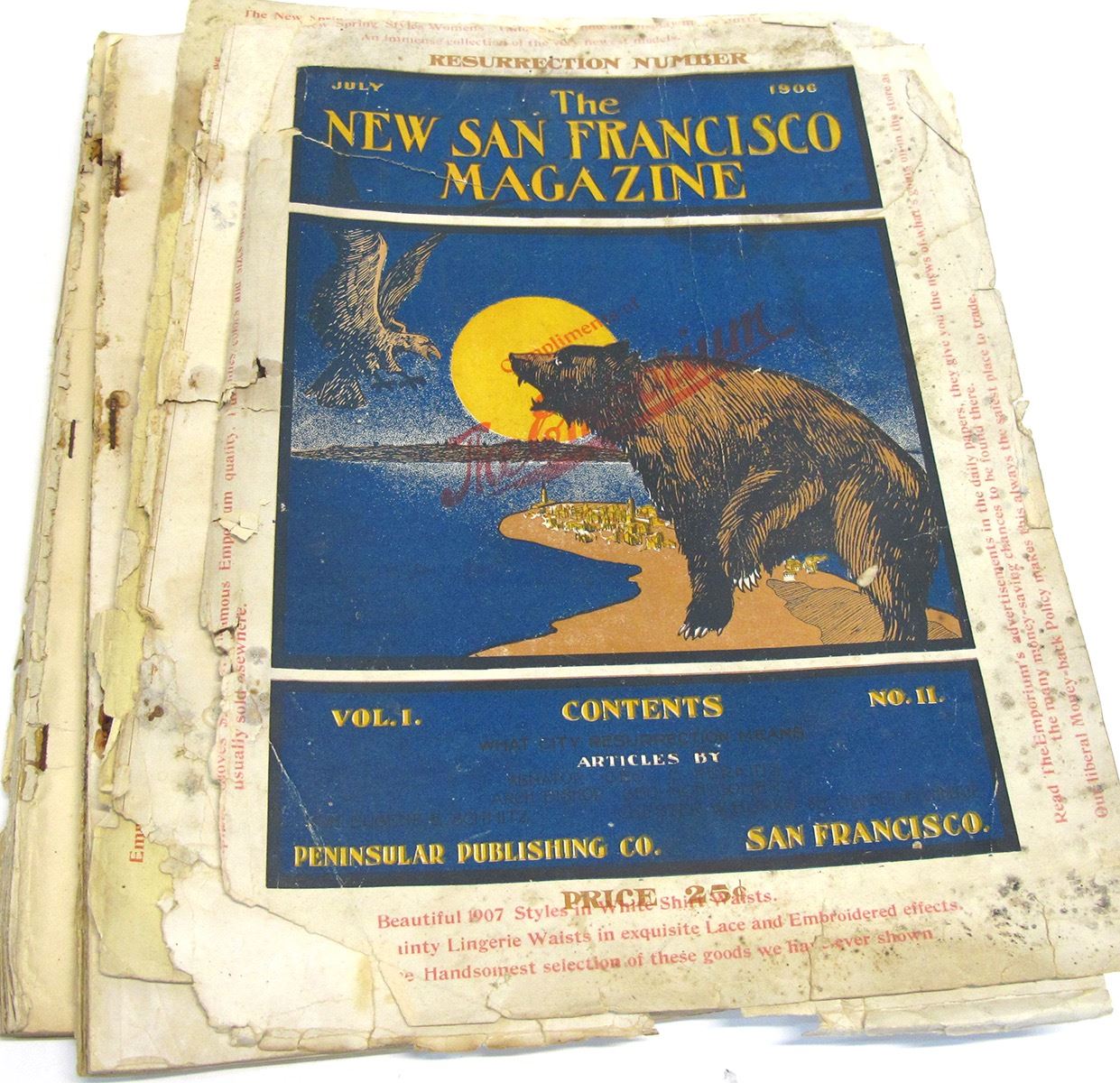 First issues after infamous earthquake.July 1906 Brown bear and eagle with moon background on cover. Numerous photos of after quake fires and devastating damage including several foldouts. Front and rear covers detached. Stains and old mold. May 1906, more photos of quake devastation plus foldouts. Front cover detached, stains. Sold as is, please inspect. Date: Location: San Francisco, California HWAC# 54440