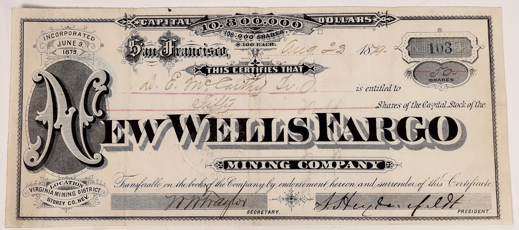 Ultra rare stock. #103 issued Aug. 22, 1879 to DE McCarthy, who was editor of the Virginia Evening Chronicle newspaper. Mine is in Virginia District, NV, on the north end of town.