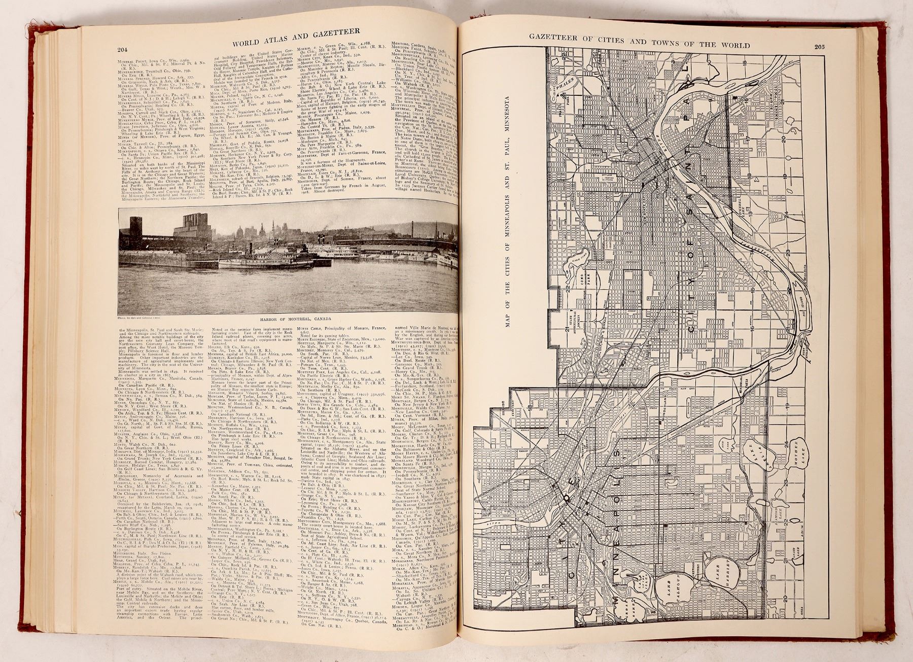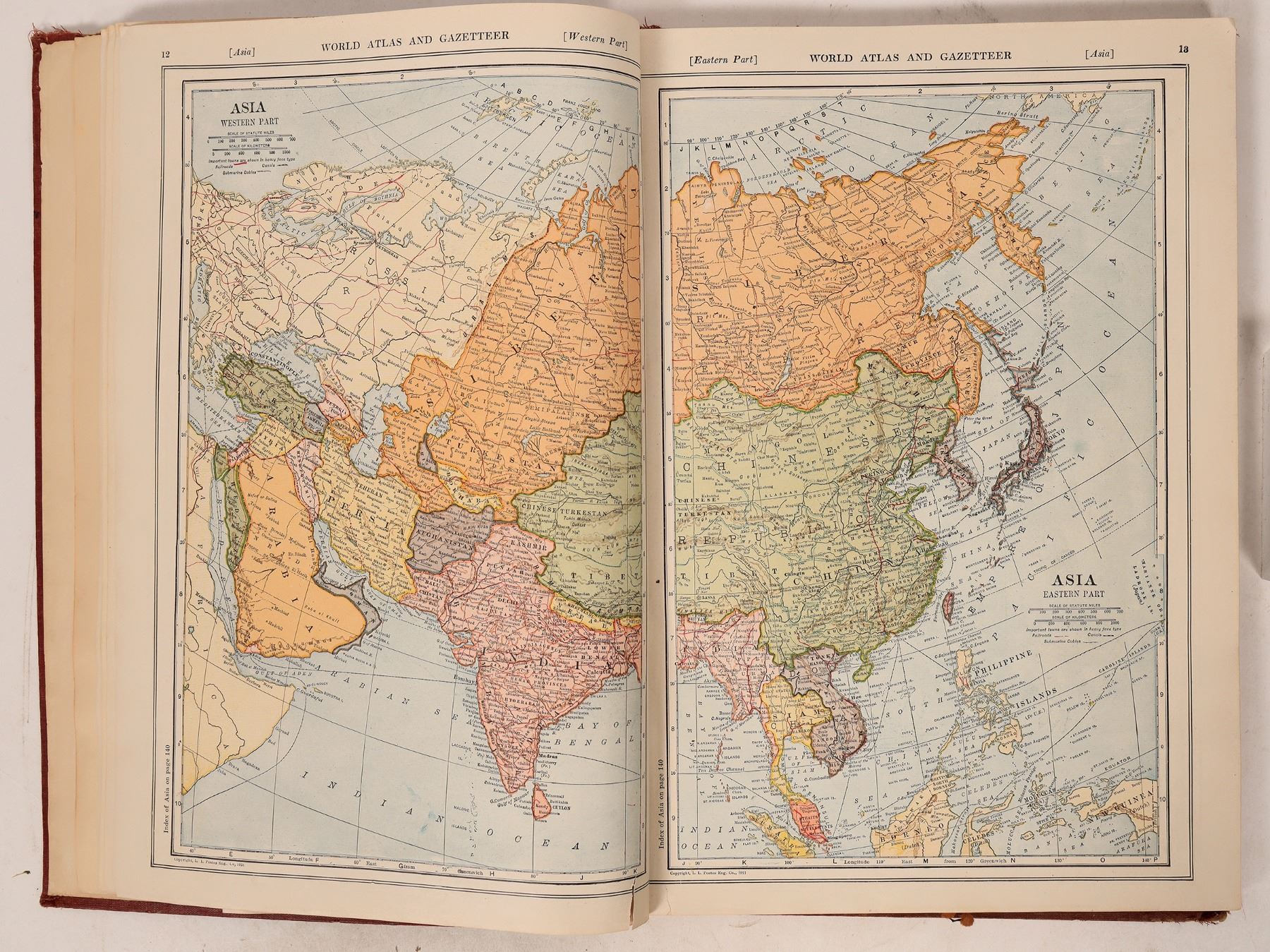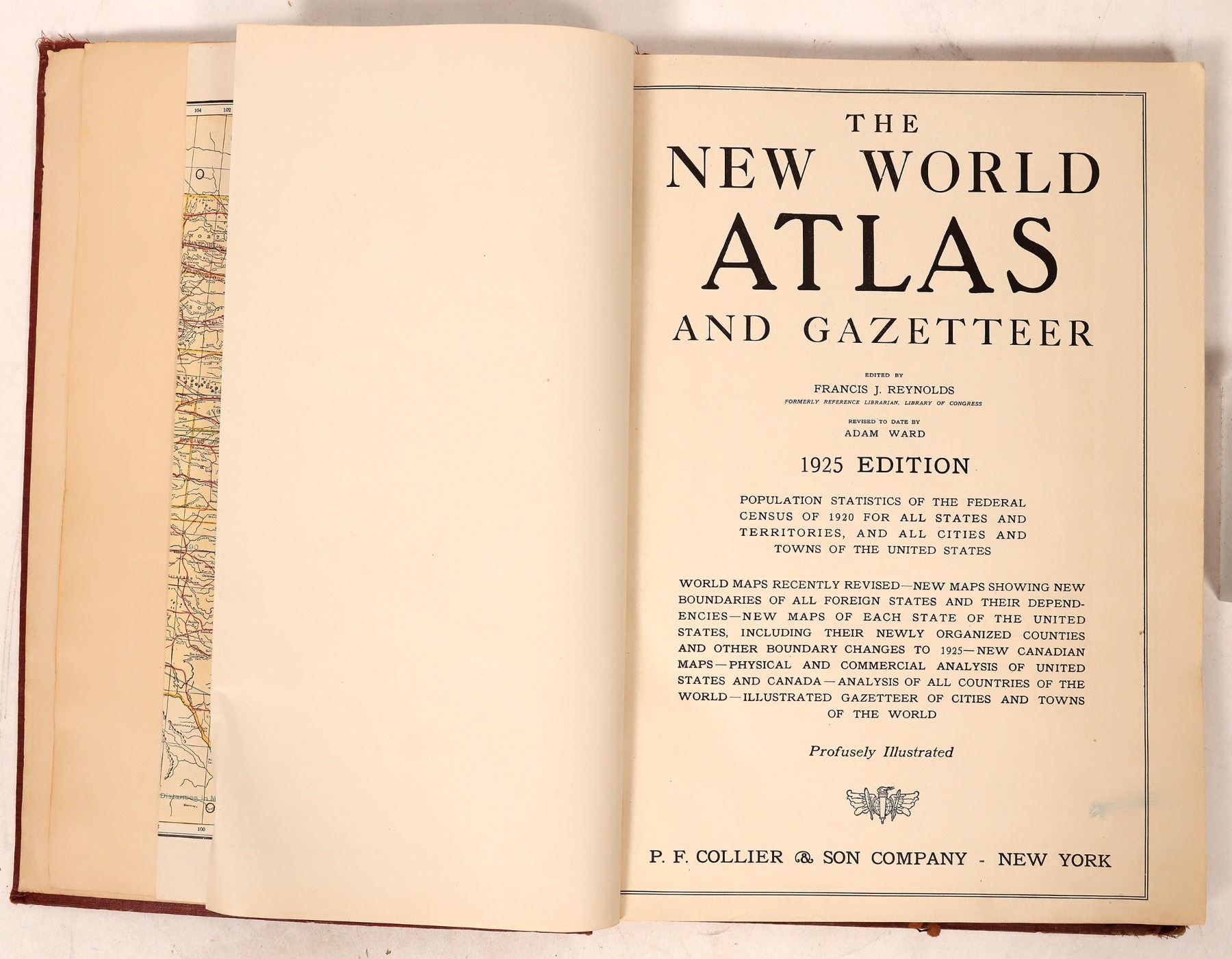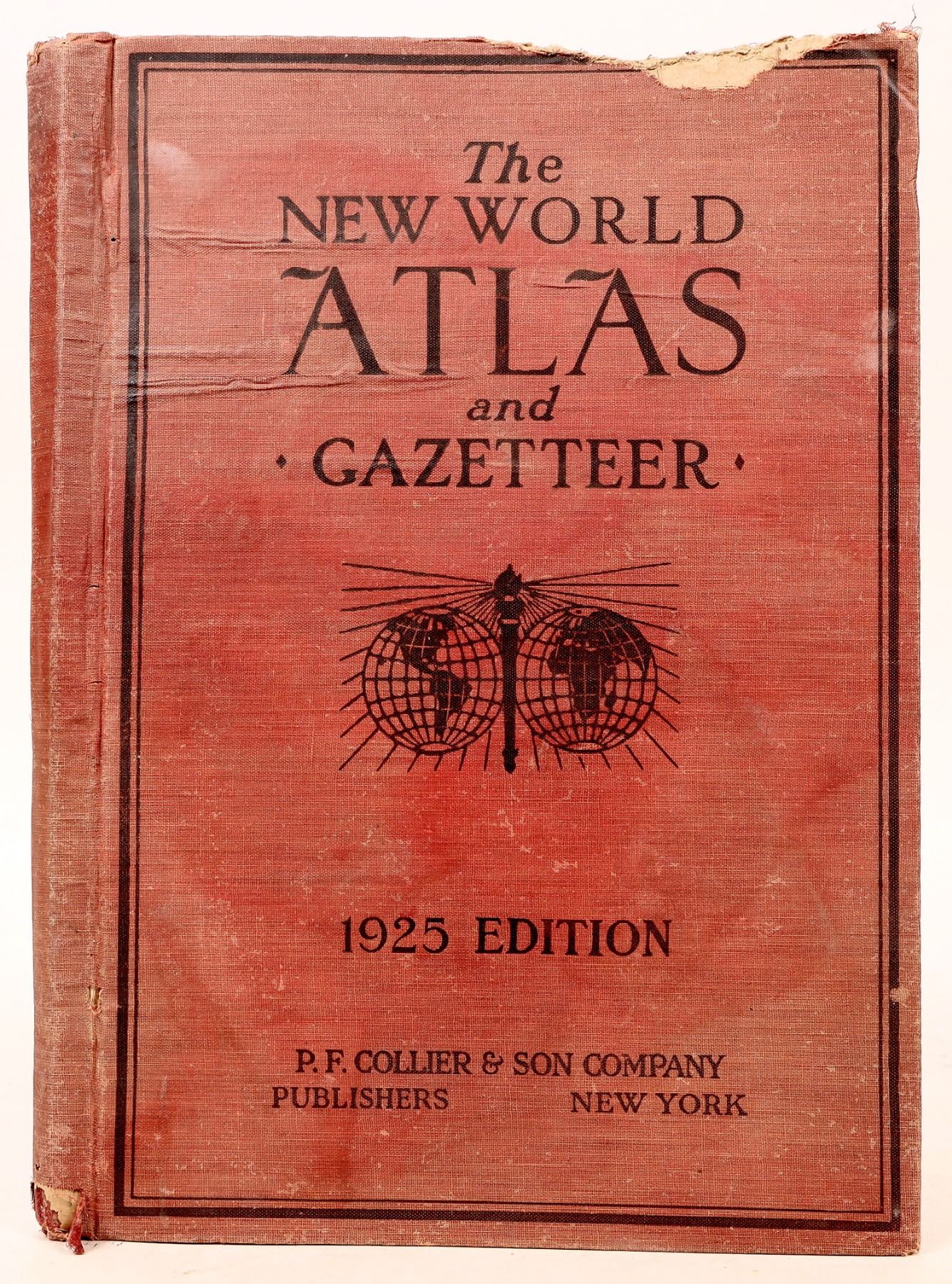 The New World Atlas and Gazetteer 1925 Edition. There are 272 pages in this 11"x 15" volume. There's a lot of damage to the boards, but the book is still very much intact. Please see photos for more details.