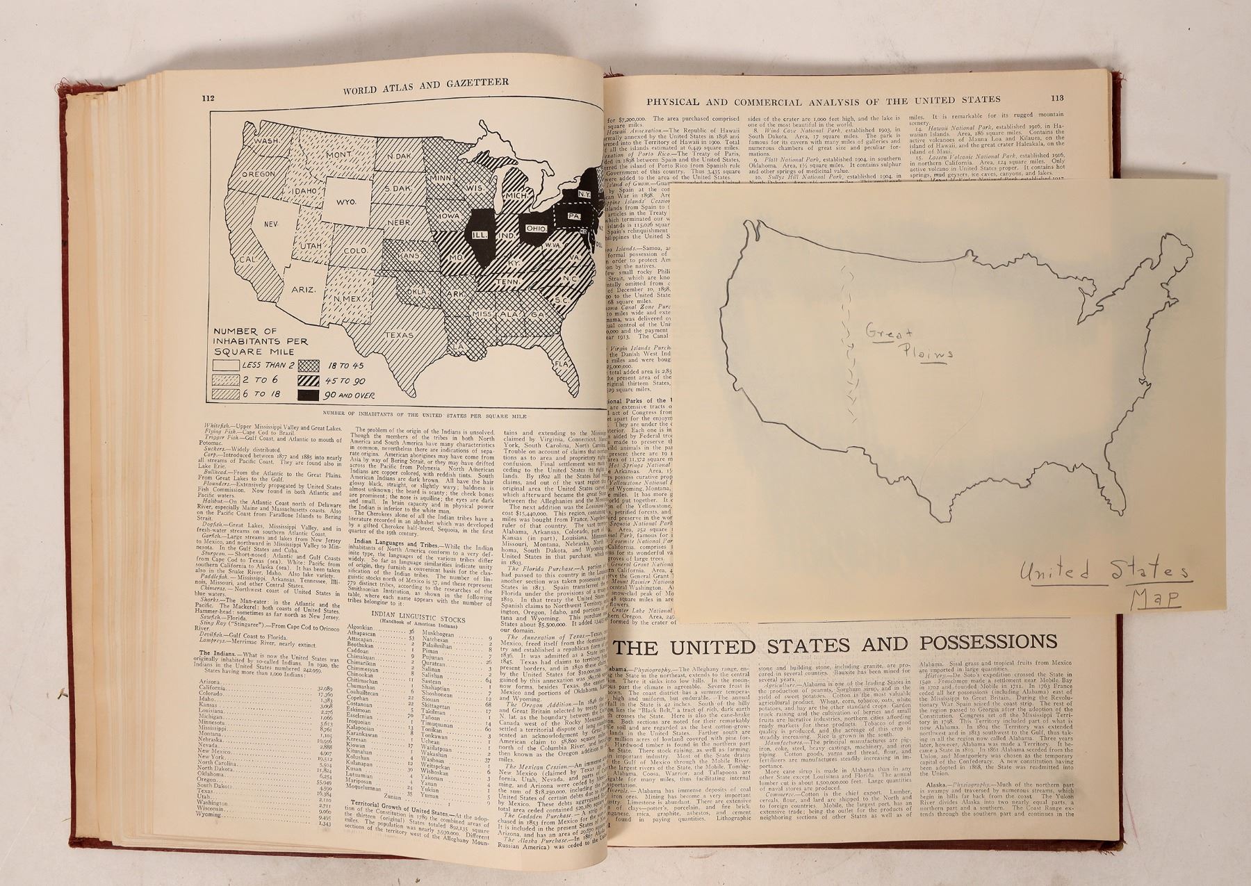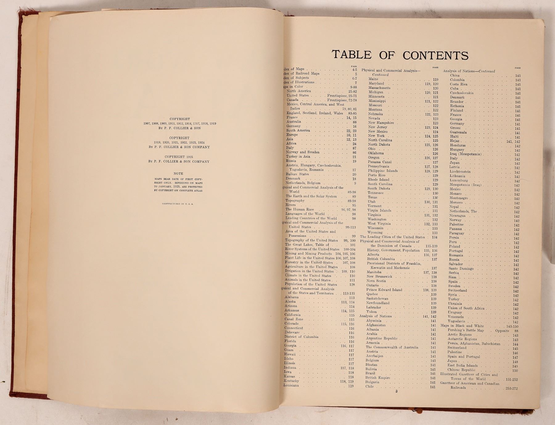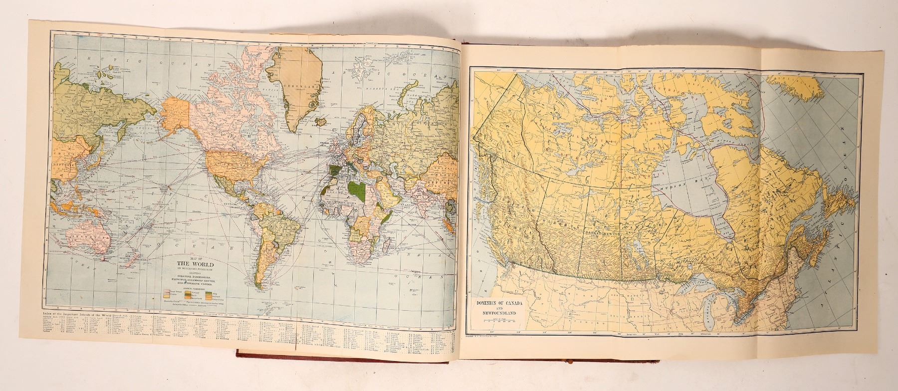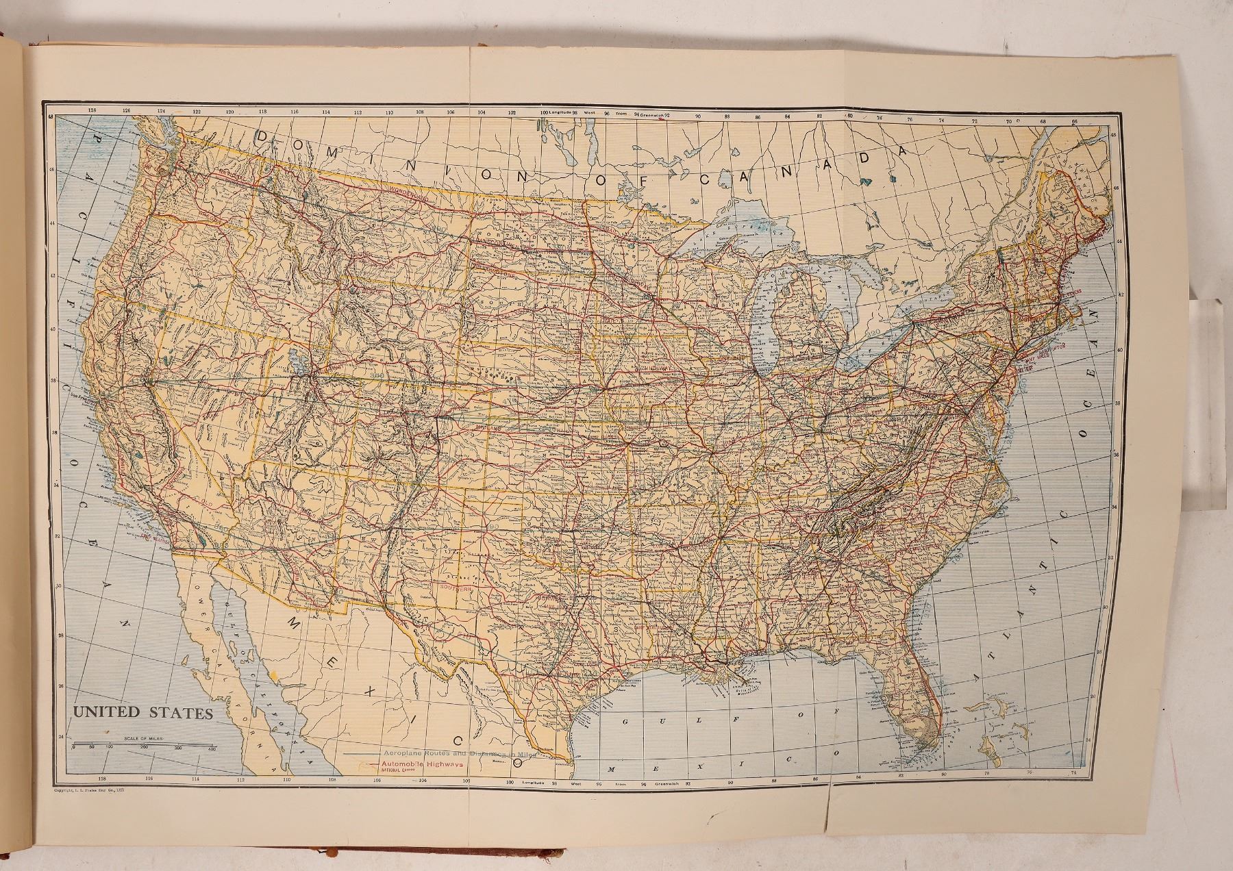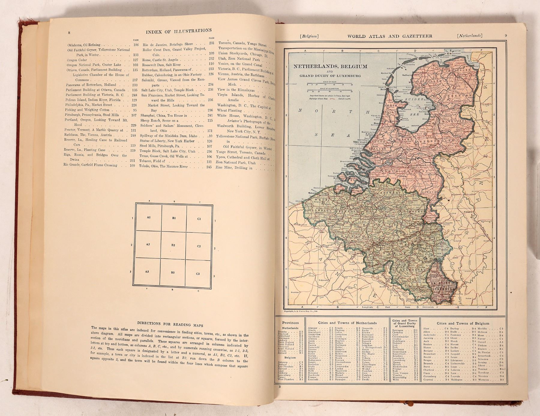 The New World Atlas and Gazetteer 1925 Edition. There are 272 pages in this 11"x 15" volume. There's a lot of damage to the boards, but the book is still very much intact. Please see photos for more details.