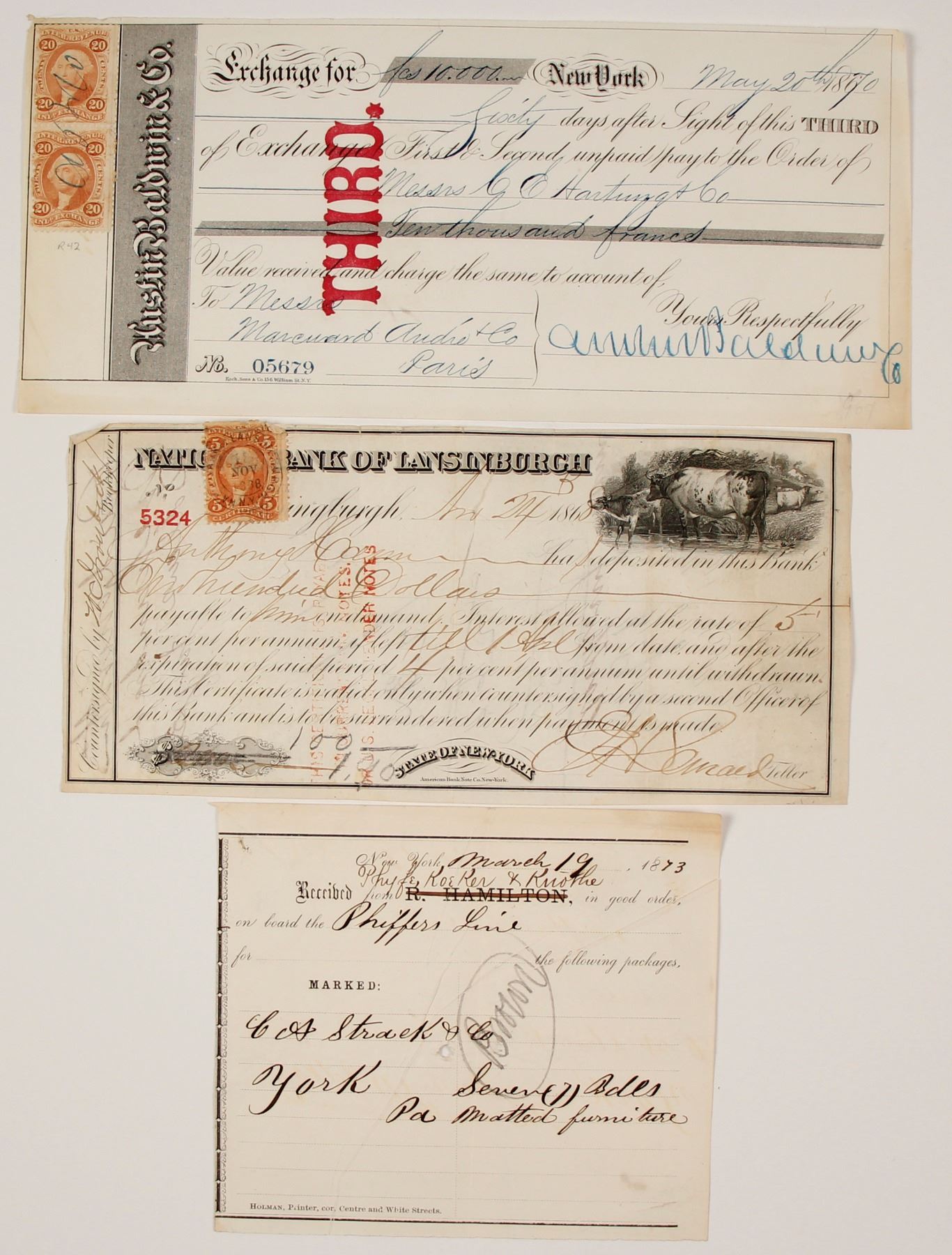 Lot of 3. 1) Huston, Baldwin & Co. 3rd of Exchange for 10,000 francs dated may 20th, 1870. To be drawn on a bank in Paris. Two 20 cent revenue stamps attached at upper left. 2) Receipt for furniture shipped on board the Phiffers Line by Phyfe, Koeker & Knother on March 19th, 1873, New York. 3)National Bank of Lansinburgh, state of New York bank note. Dated August 24, 1868 for $100 dollars. Revenue stamp on upper left, very nice.
