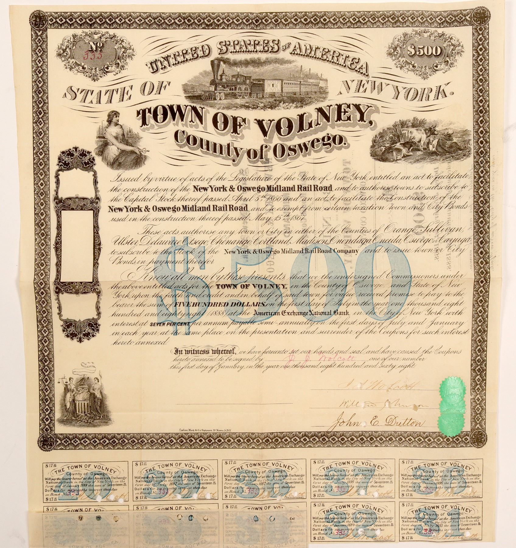 Cancelled $500 bond for State of New York, New York & Oswego Midland Railroad Co. cert. #335 with 13 coupons issued Jan 1, 1868. Payable July 1, 1888 at American Exchange National Bank, NYC at 7% per annum. Signed by 3 trustees. Printed: Corlies, Macy & Co., Stationers, 33 Nassau St. NY. Vignette of train center top, 3 cows right top, allegorical women left side, frame on left center and allegorical man with staff and women with scale besides shield bottom left. Black border.