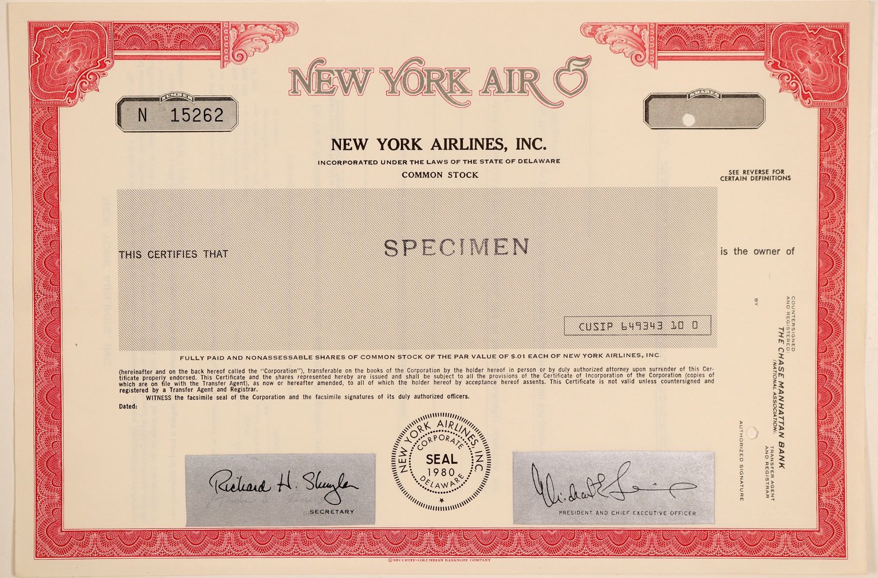 New York Airlines, Inc. No. N 15262. Printed signatures of the president and secretary. Punch cancelled. Red border and color logo. Printed by Security-Columbian Banknote Company. 8 x 12" Formed in 1980 by Texas Air as a line offering cheaper and equally frequent (hourly) flights between New York, Boston and Washington National Airport. Merged with Continental Airlines in 1987. Ken Prag Collection