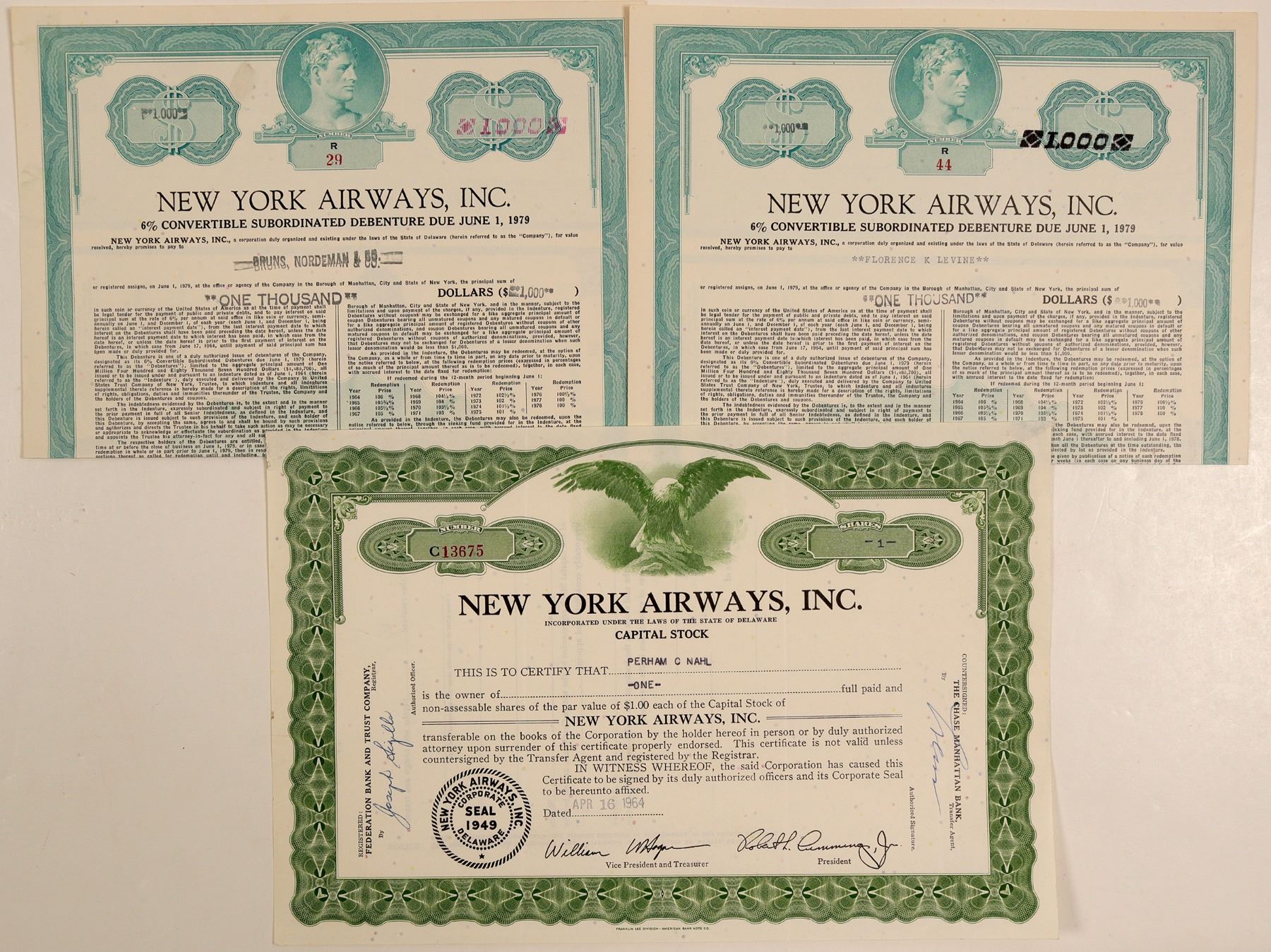 Lot of 3. New York Airways was a helicopter airline in the New York City area, founded as a mail and cargo carrier. Operated 1949-1979. 1) One stock certificate issued in 1964 to Perham C Nahl for one share. Not cancelled. Green border, black print, eagle vignette. Folds. 8 x 12" 2) Two $1,000 bonds, issued in 1966 and 1969, both punch cancelled. Blue border and allegorical vignette. 13 x 9.5" Ken Prag Collection