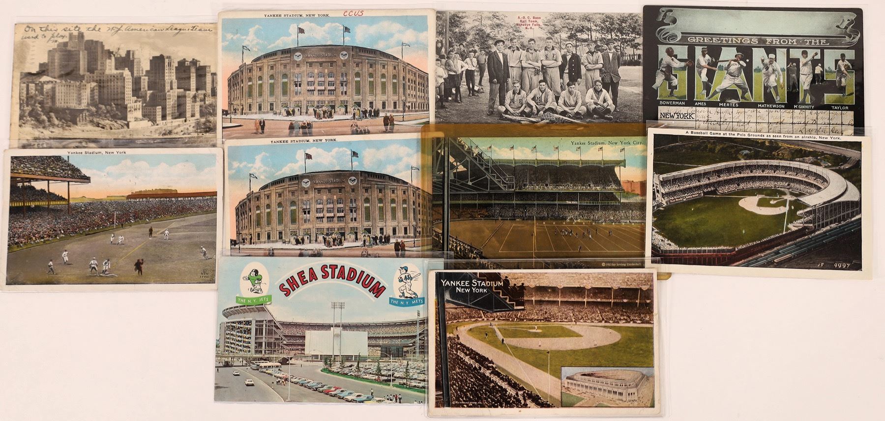 These are 10 postcards with New York baseball connections. They include photos of Yankee Stadium, The Polo Grounds and Shea Stadium. One of them has a shot of Riverside Drive is labeled as the former home of the Yankees. This up until they played home games at the Polo Grounds and then their own iconic ballpark. Some of the cards are blank, some are not. Please see photos for more detail and condition.