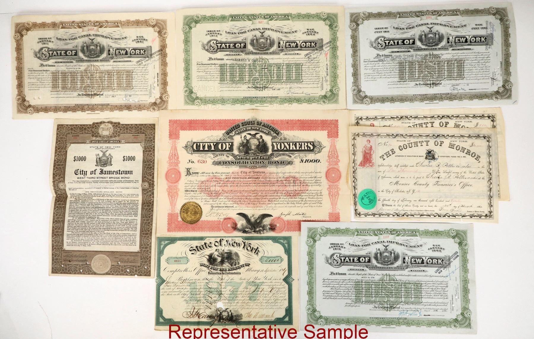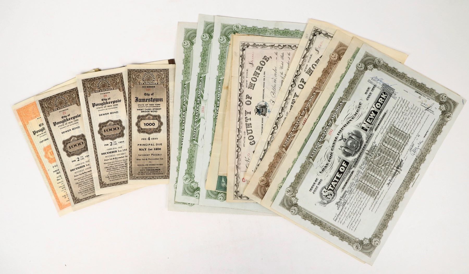 21 mostly New York Municipal Bonds 1864-1955 from Poughkeepsie, Jamestown, Erie, Oswego and Champlain, Cayuga, Seneca, Monroe County, Yonkers. 8 different. Great variety with early bonds, some coupons attached, canal improvements, bridges, sewer, infirmary, plus one bond from the State of New York for debt for payment of counties to volunteers 1864.